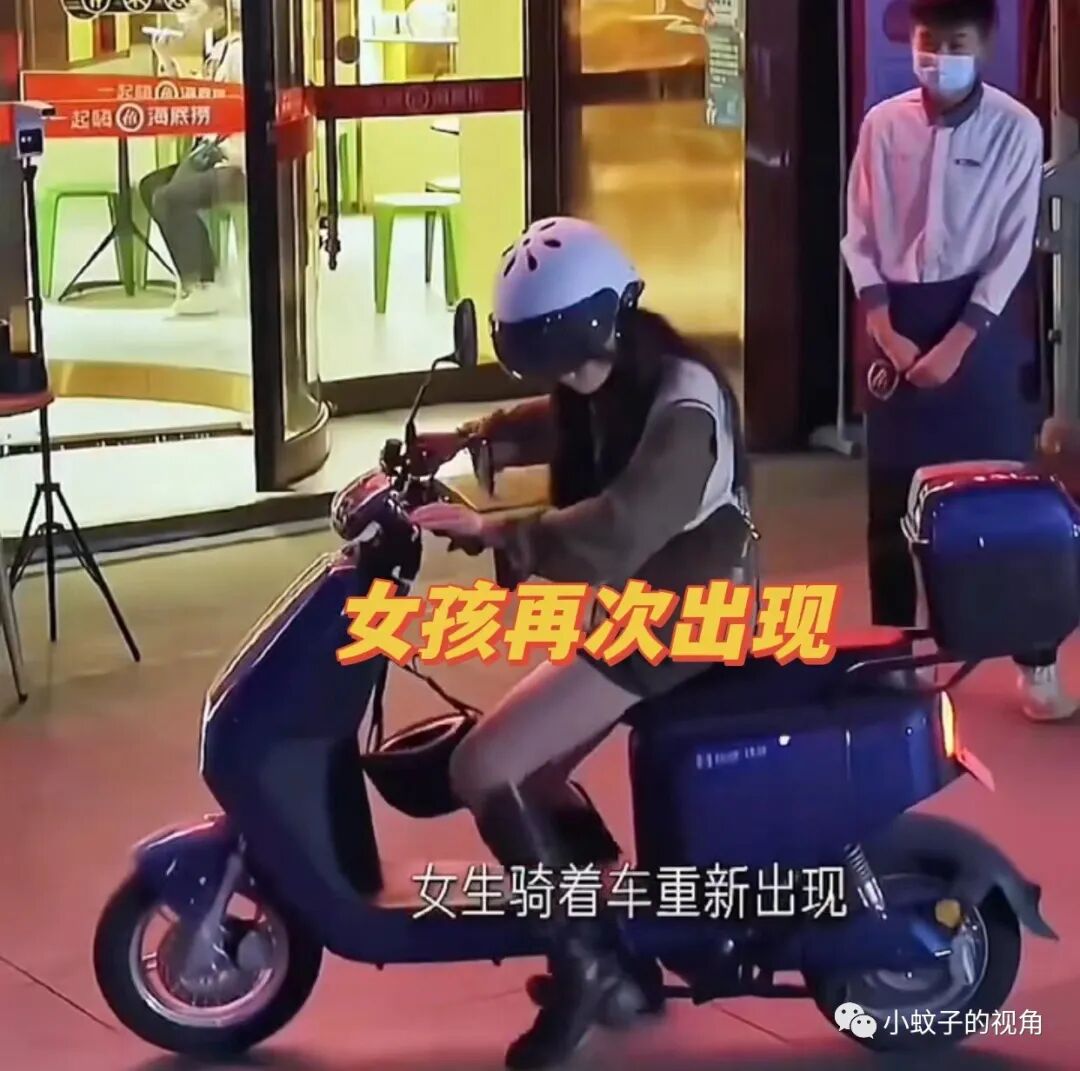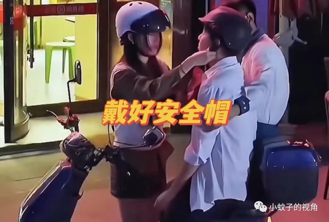 却没想到,过了一会儿那个声称“不管他”的女孩又出现了,这次她是骑着电动车来的,自己头上戴着一个头盔,手里还拿着一个。