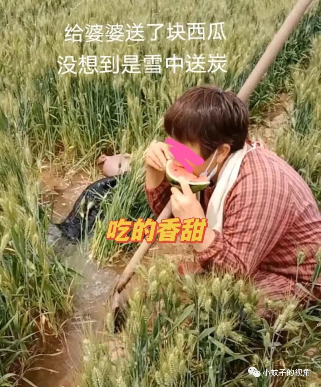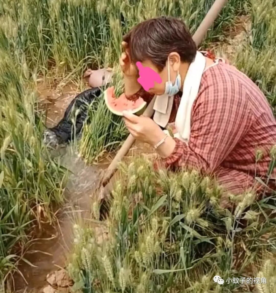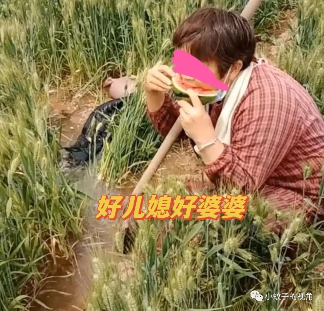 正在浇地的婆婆没想到儿媳能给送瓜吃,感动的不知所措,赶紧就着浇地的水洗了洗手,在衣服上蹭了两下就接过了西瓜。