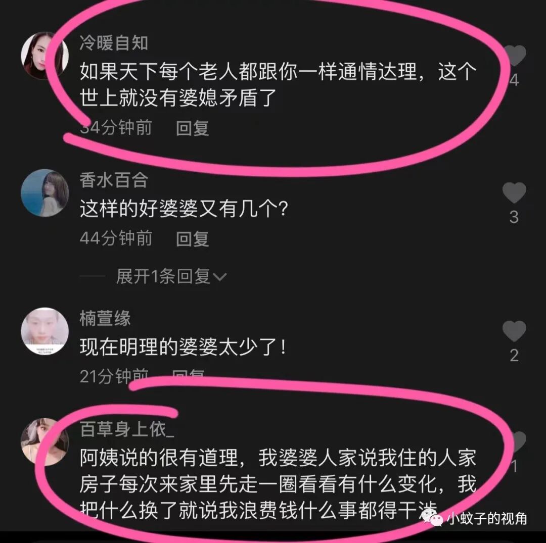 也有网友说:阿姨说得很有道理,我婆婆人家说:我住的她的房子,每次来家里先走一圈看看有什么变化,我把什么换了,就说我浪费钱,什么都得干涉。