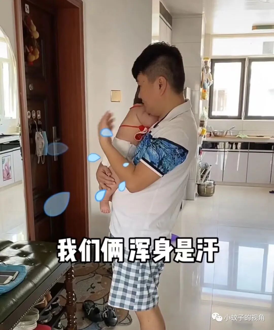 听到孩子在房间吭吭唧唧地哭,他顾不得身体疲累,赶紧冲到房间看孩子。把孩子的尿不湿换下来,打算把她抱到客厅玩。