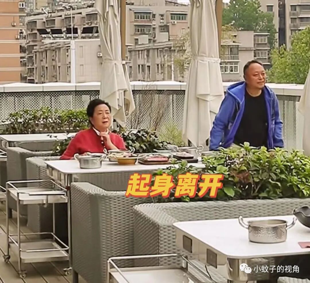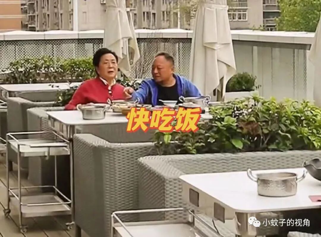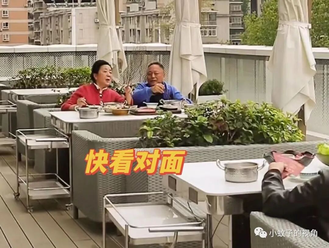 奶奶不为所动,依然目不转睛地盯着对面的情侣,对爷爷的夹菜还有点不耐烦。