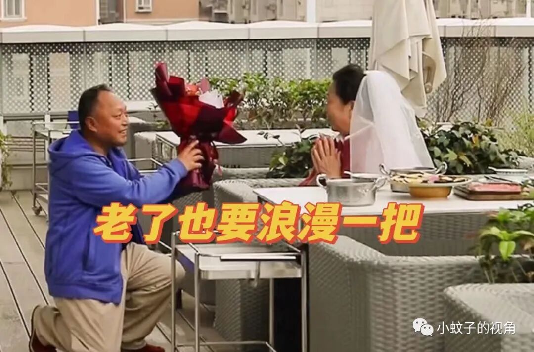 爷爷示意服务员帮他拿来那束鲜花,对着奶奶单膝跪地:“老伴,这也是我为你准备的。”