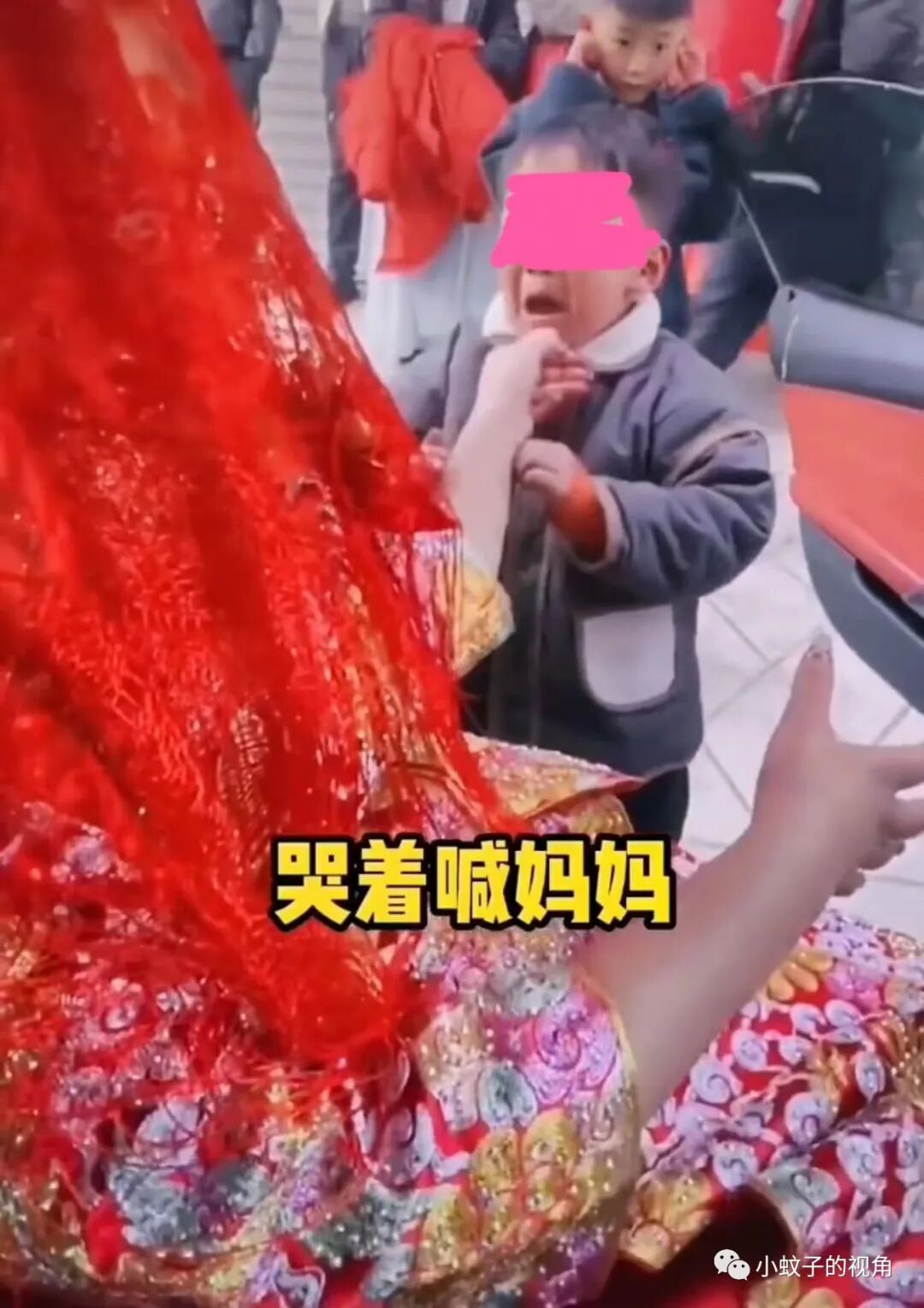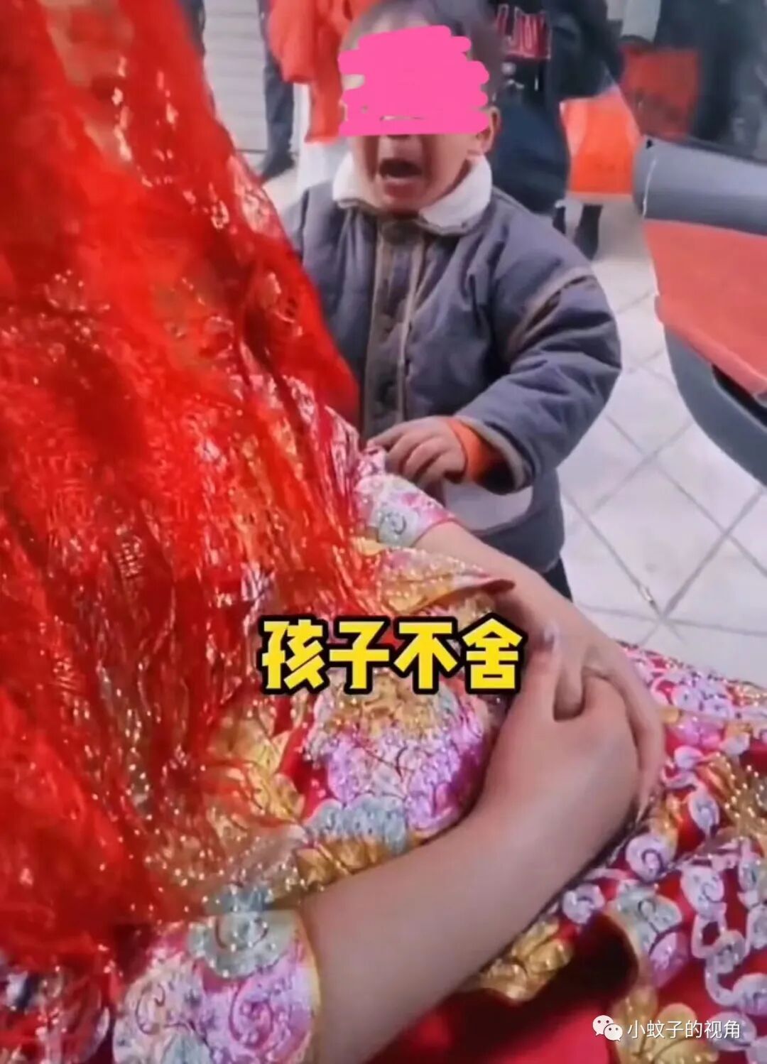 结婚的那一天,她穿着红嫁衣、盖着红盖头坐上婚车的那一刻,孩子仿佛预感到了什么,哭喊着“妈妈”去抓住新娘的衣服,想要跟着一起上车。