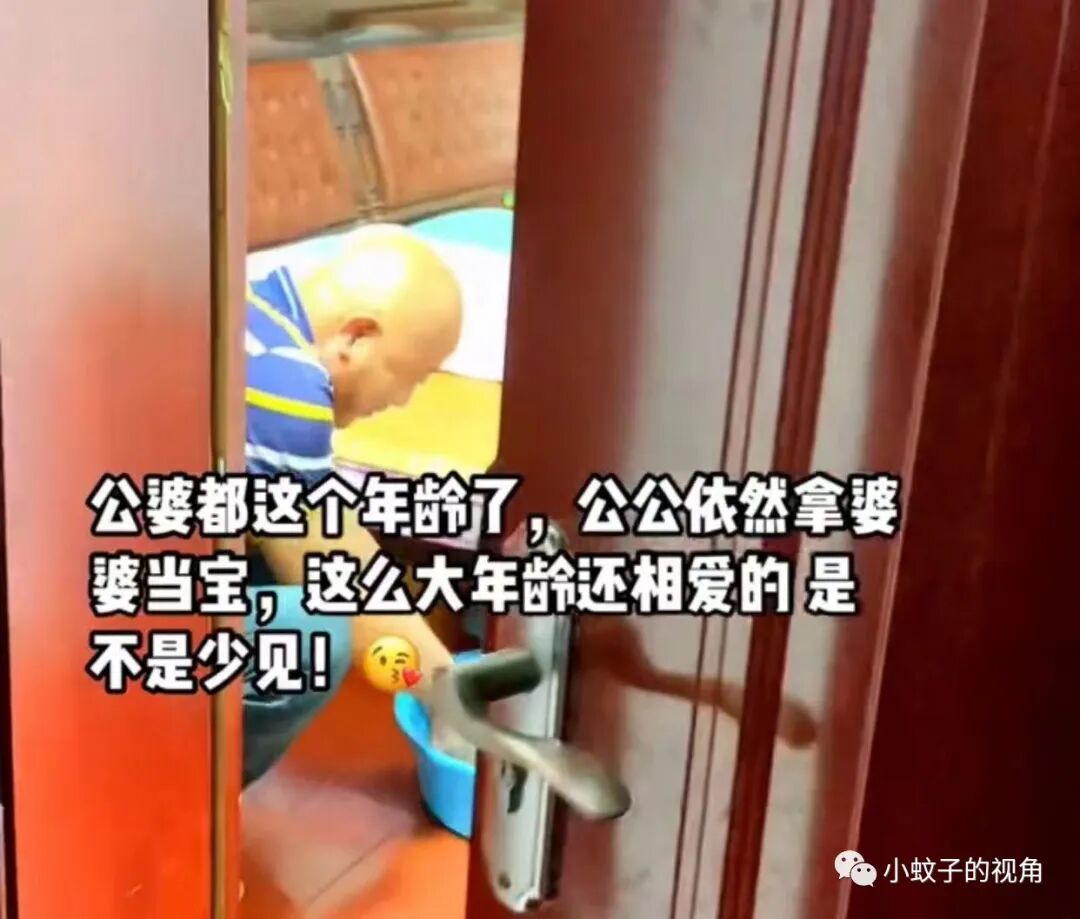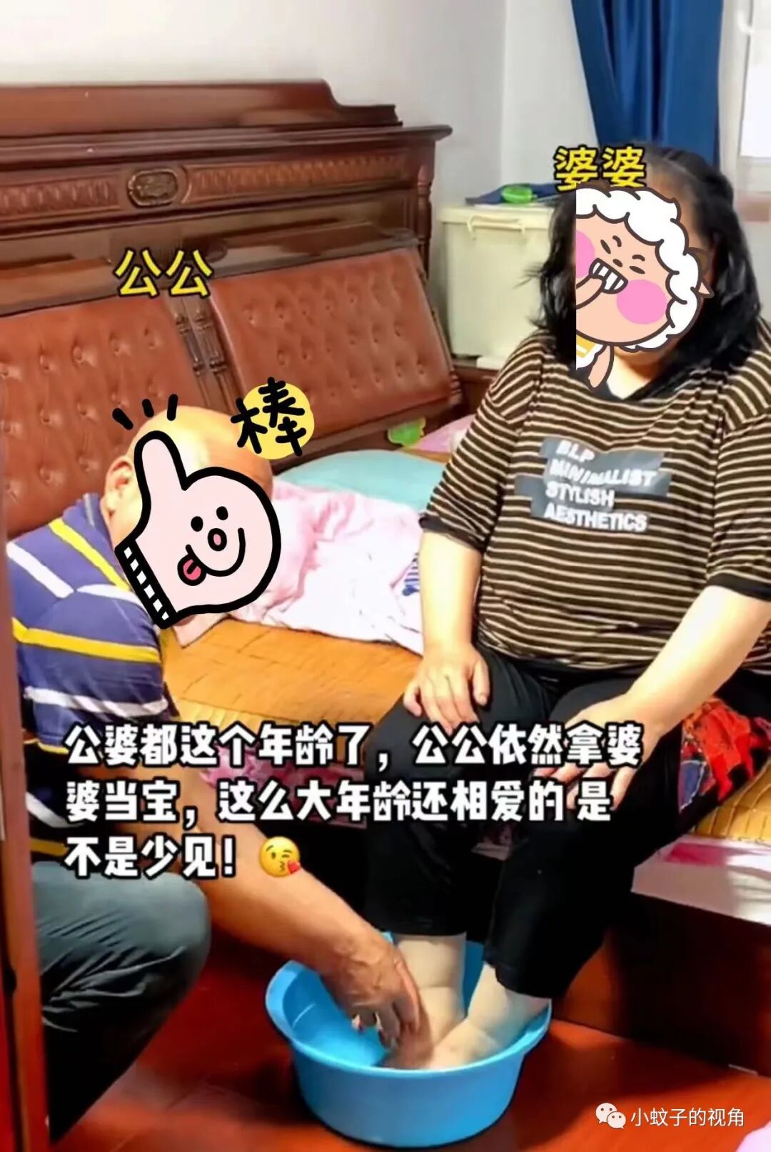 据这位女子介绍,吃过晚饭后,她通过公婆半掩的房门看到了令她震惊的一幕:公公正在给婆婆洗脚。