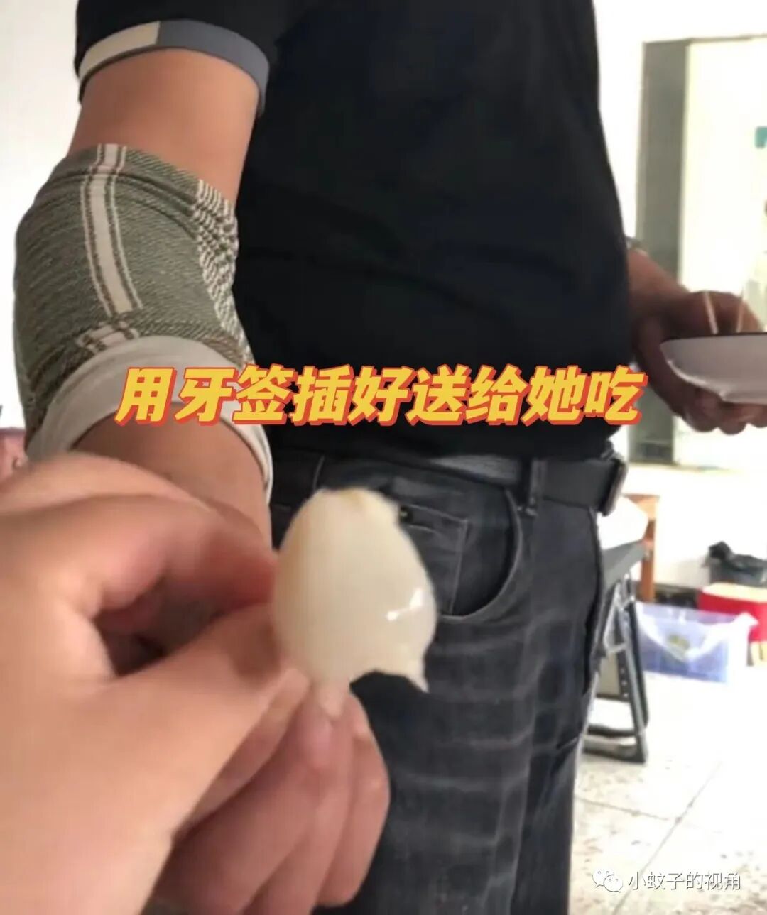 她正在房间玩手机的时候,公公给她端来一盘荔枝,这些荔枝都拔好了皮,每个荔枝上都插着一根牙签,方便她吃。