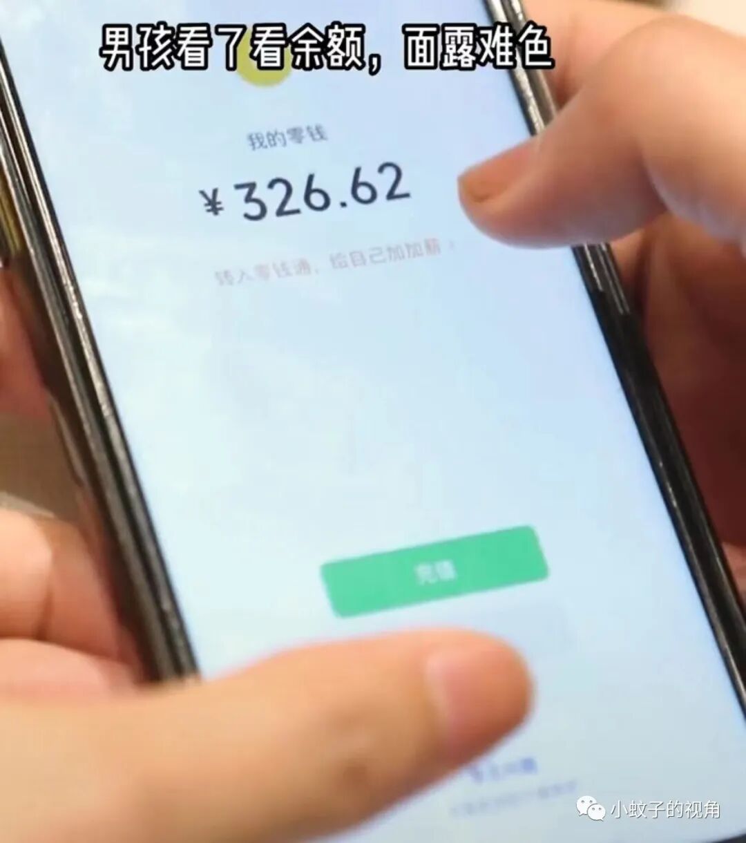 男孩看着一桌子饭菜,又看了自己的钱包余额,只有300多块钱了,可能不太够今天的开销,忍不住有点为难。