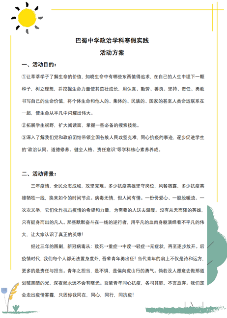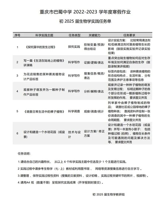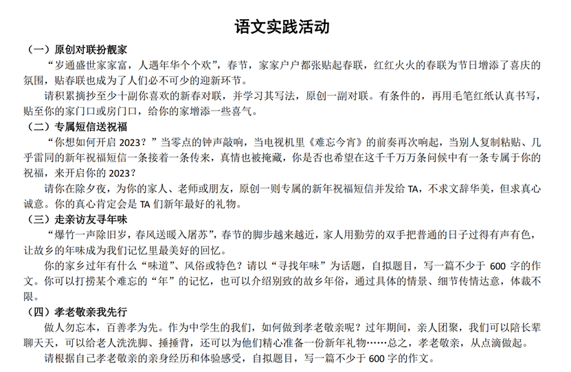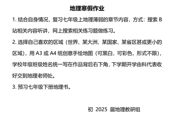 当点点红梅绽放在冬日的花园中时,快乐的寒假生活已拉开了序幕。为了让同学们度过一个充实有意义的寒假,初2025届教师们为同学们准备了精彩有趣的“寒假大礼包”,把学习与生活相融合,把理论和实践相结合,鼓励同学们链接世界,拓展视野。