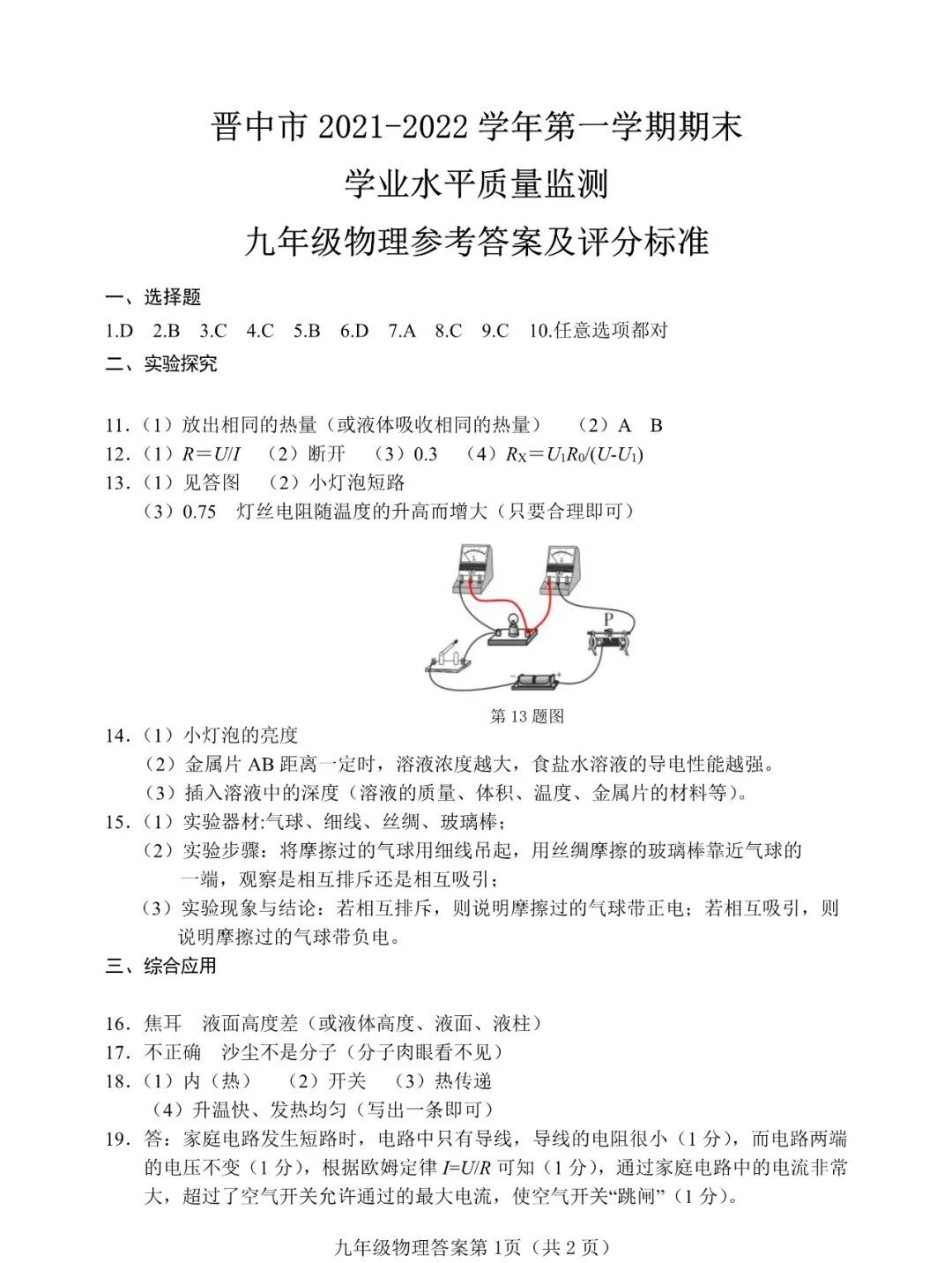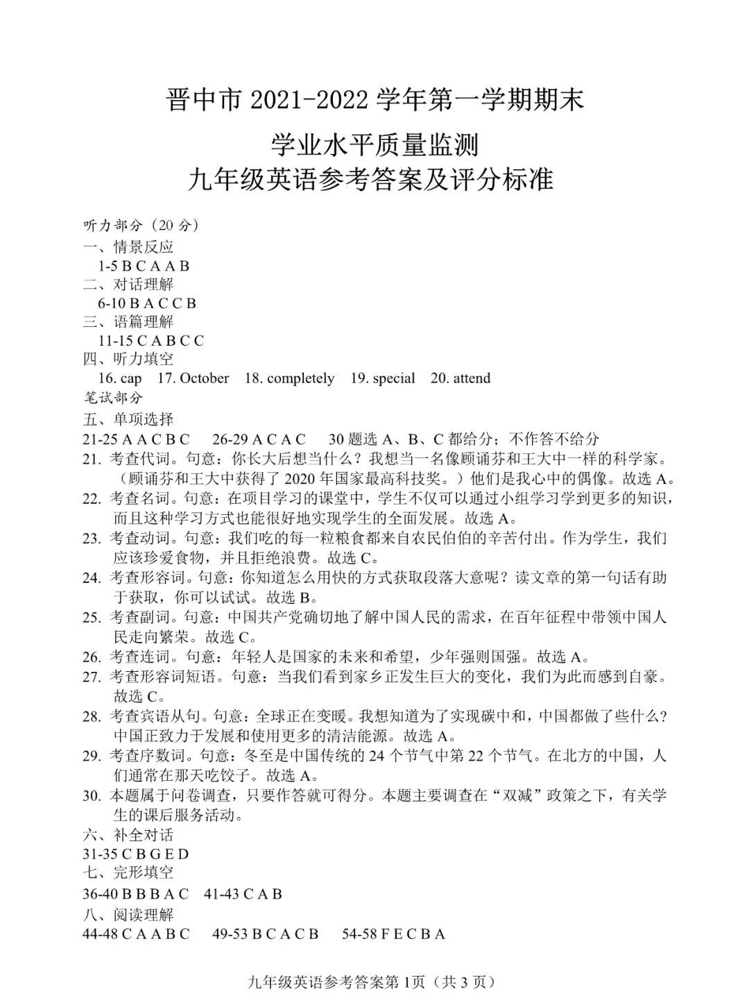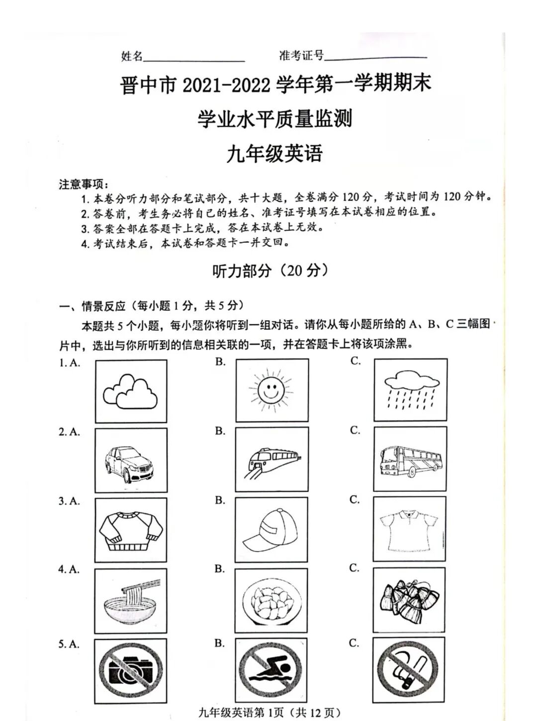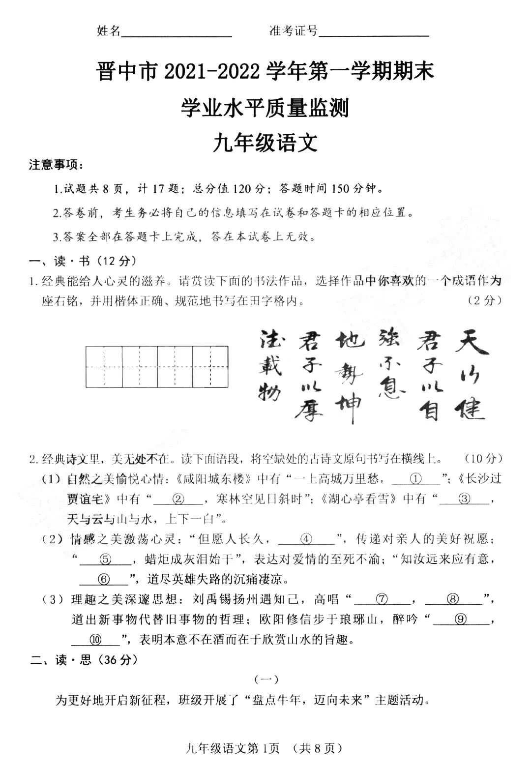 【初三全科】太原2021-2022学年第一学期期末试题及答案汇总