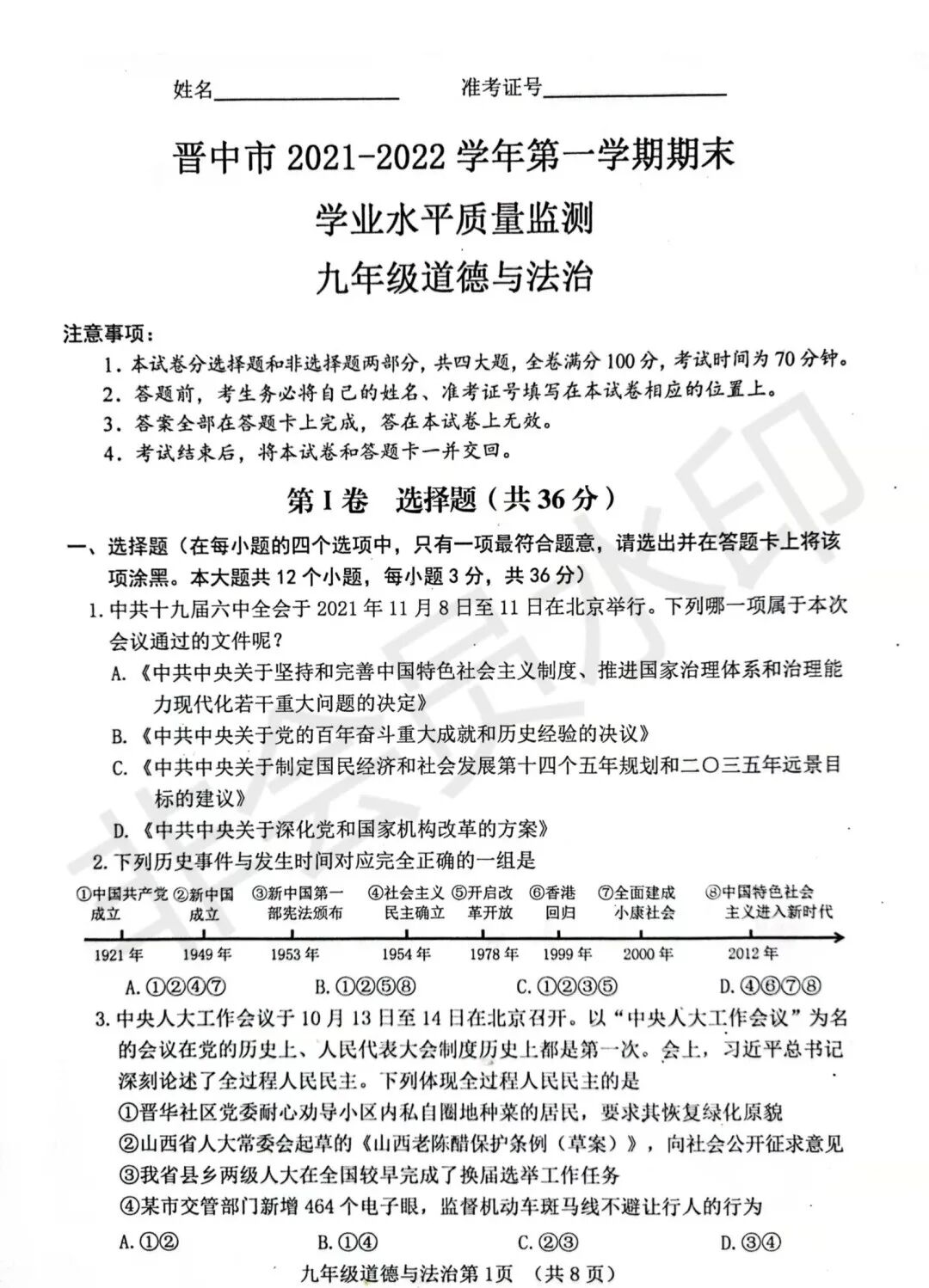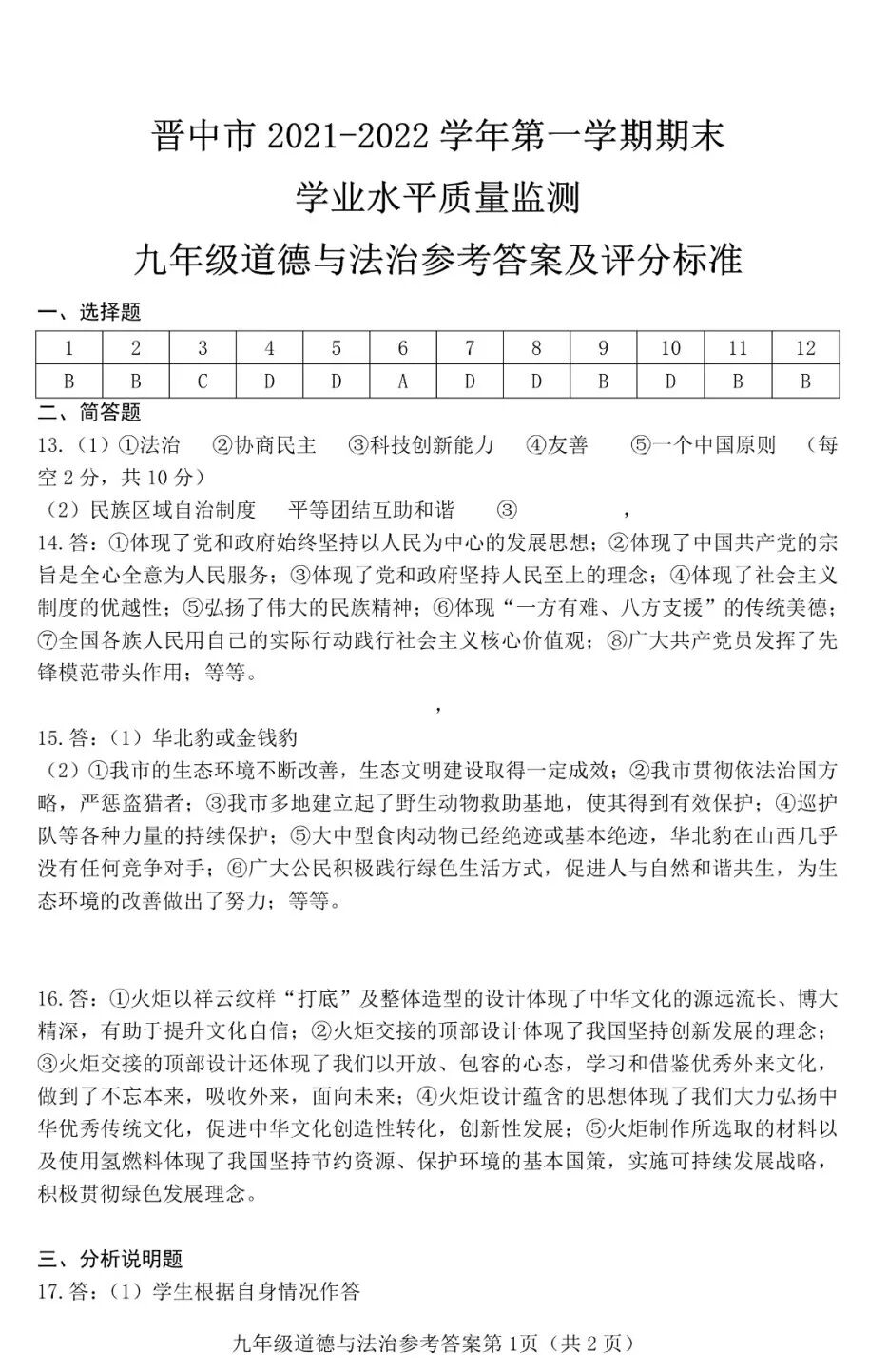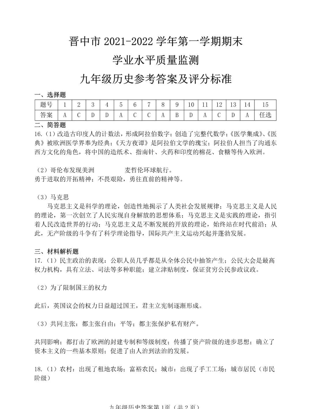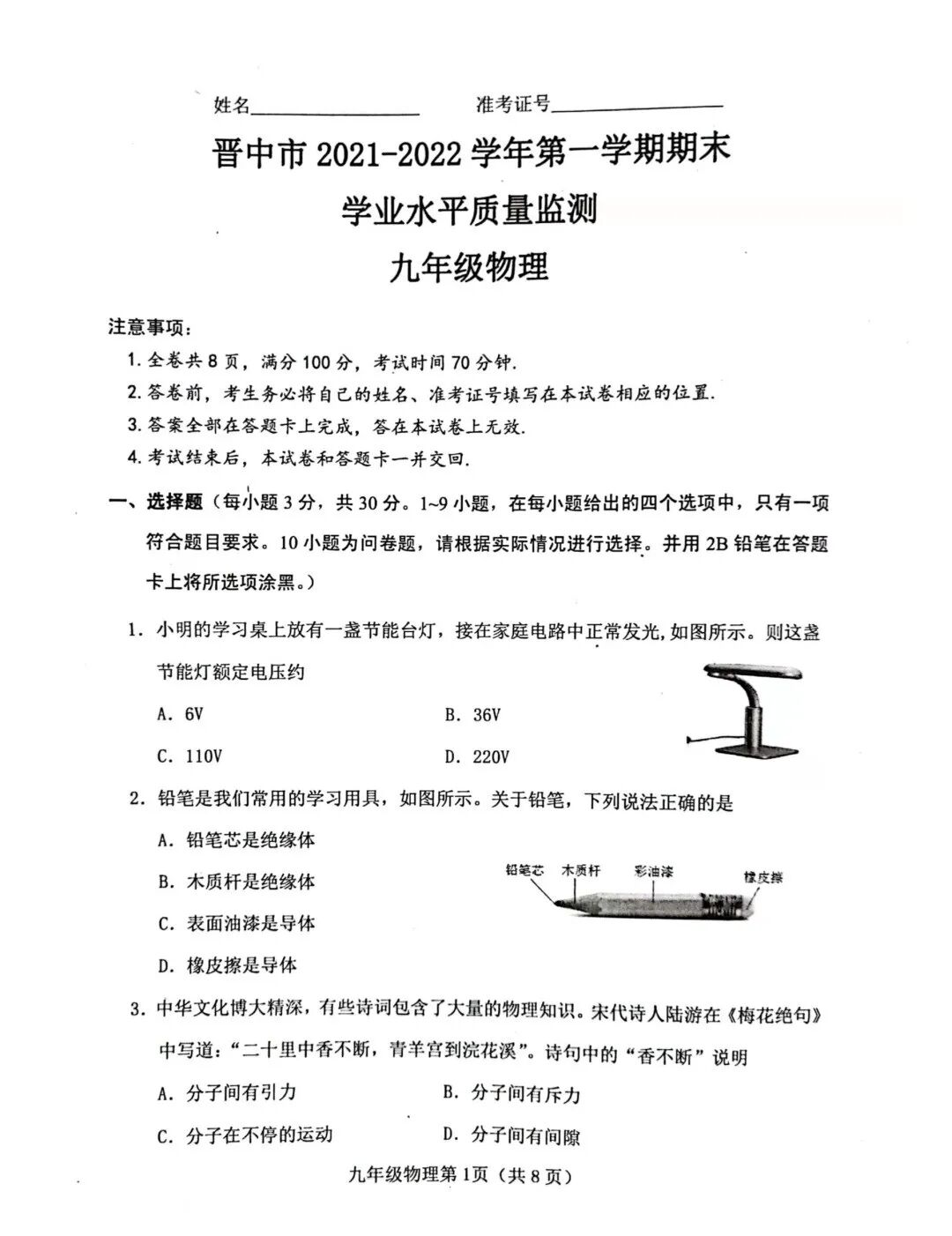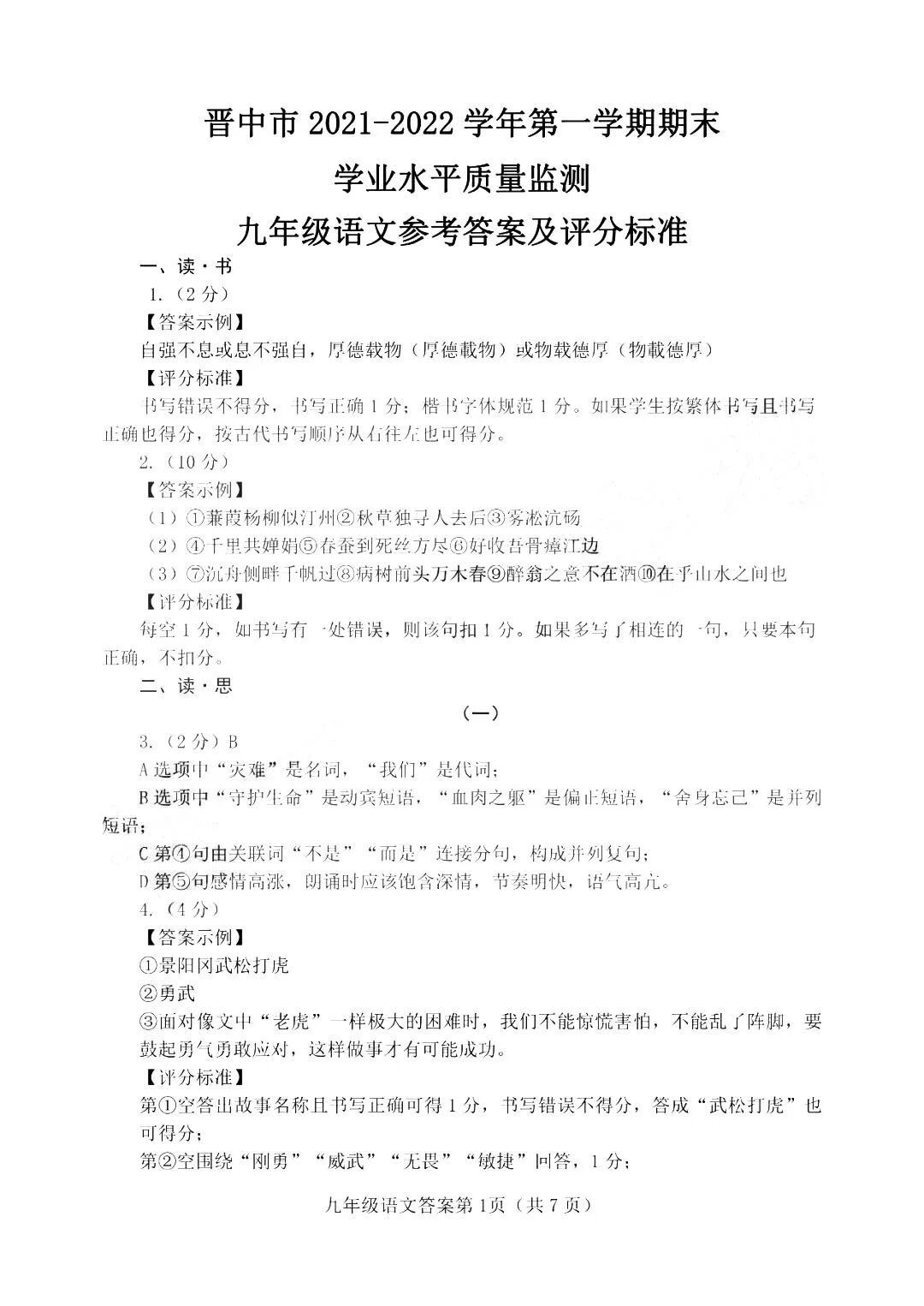 【初三全科】太原2021-2022学年第一学期期末试题及答案汇总