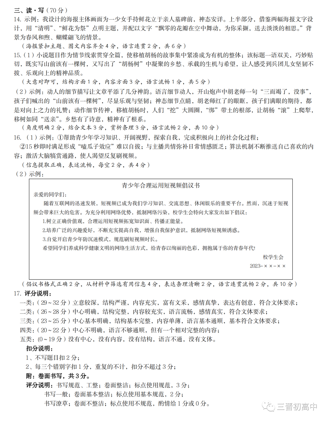 2023年山西省初中学业水平测试信息卷试题答案(含听力)