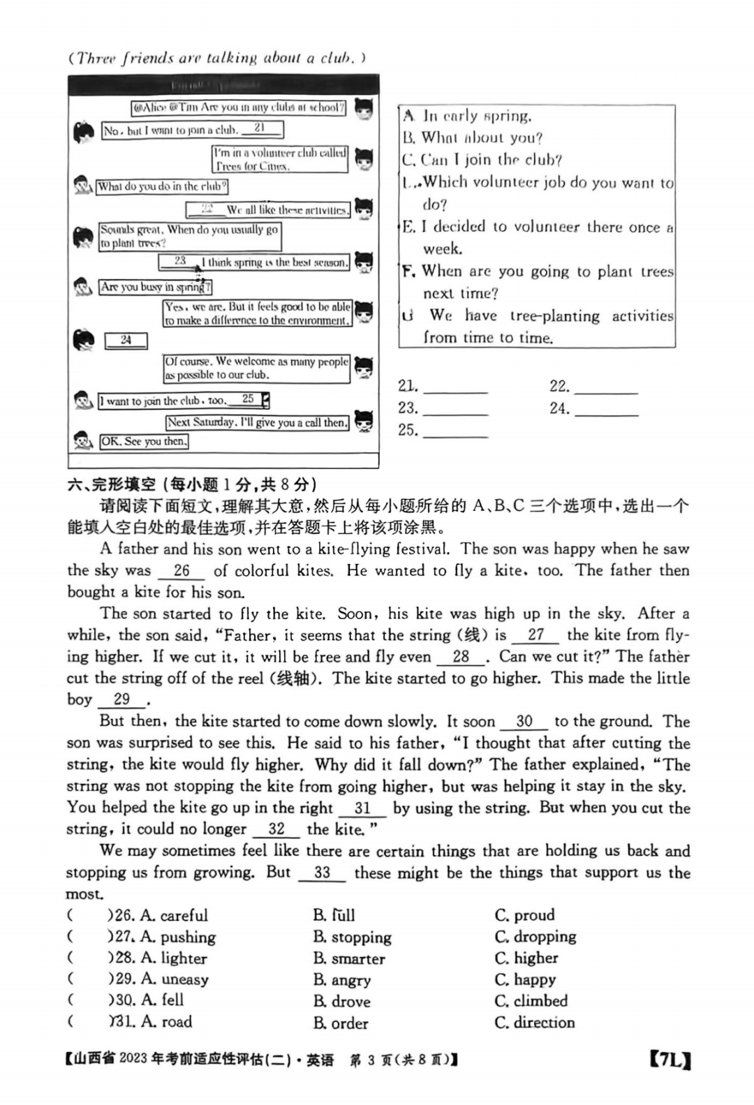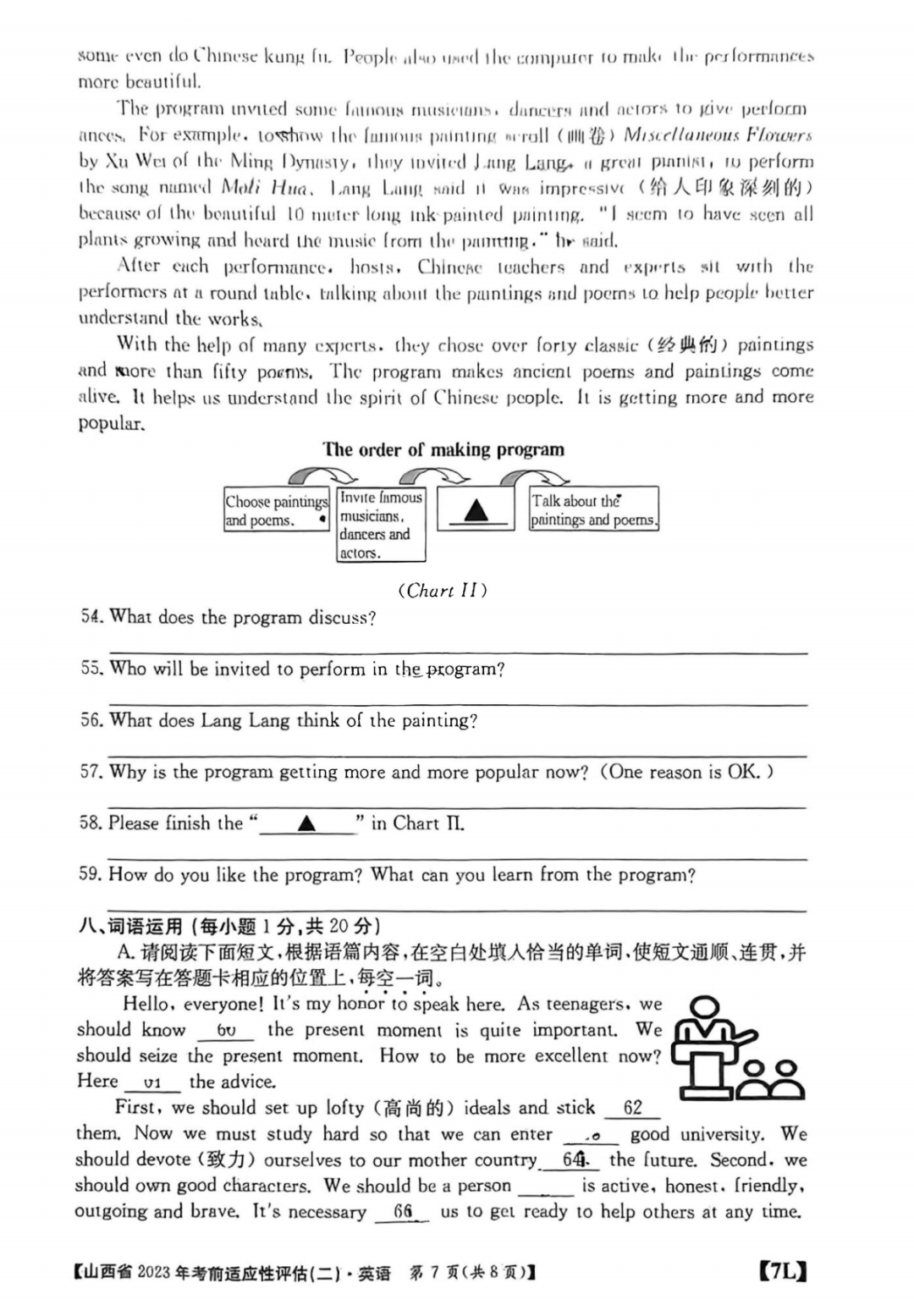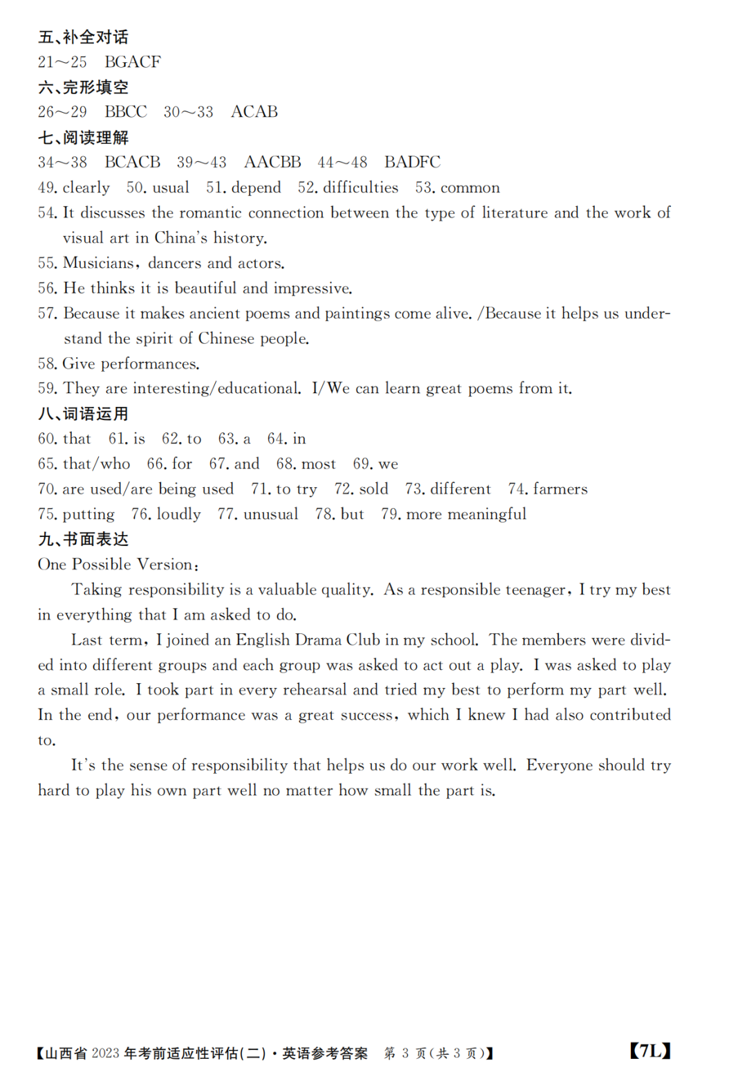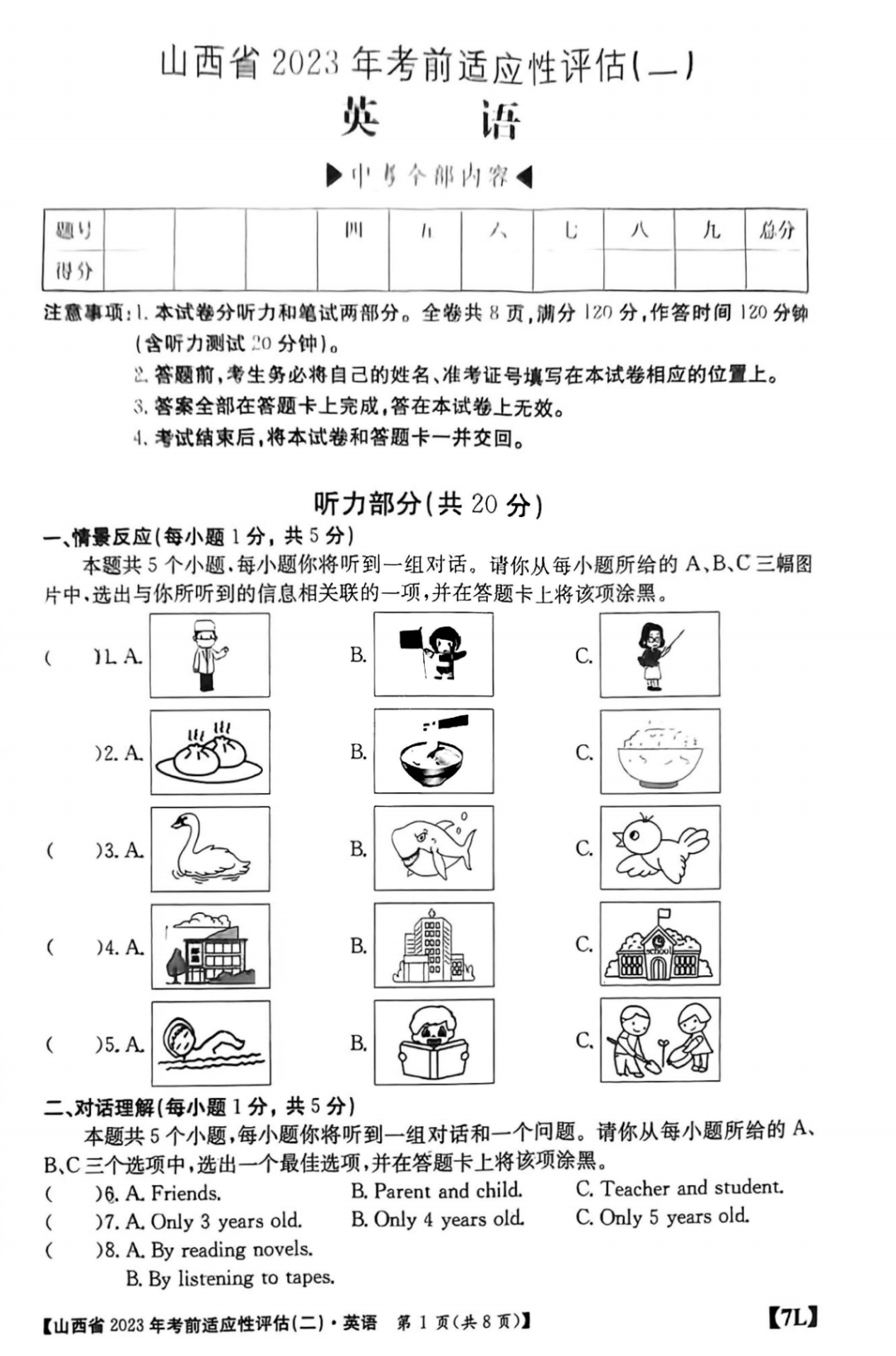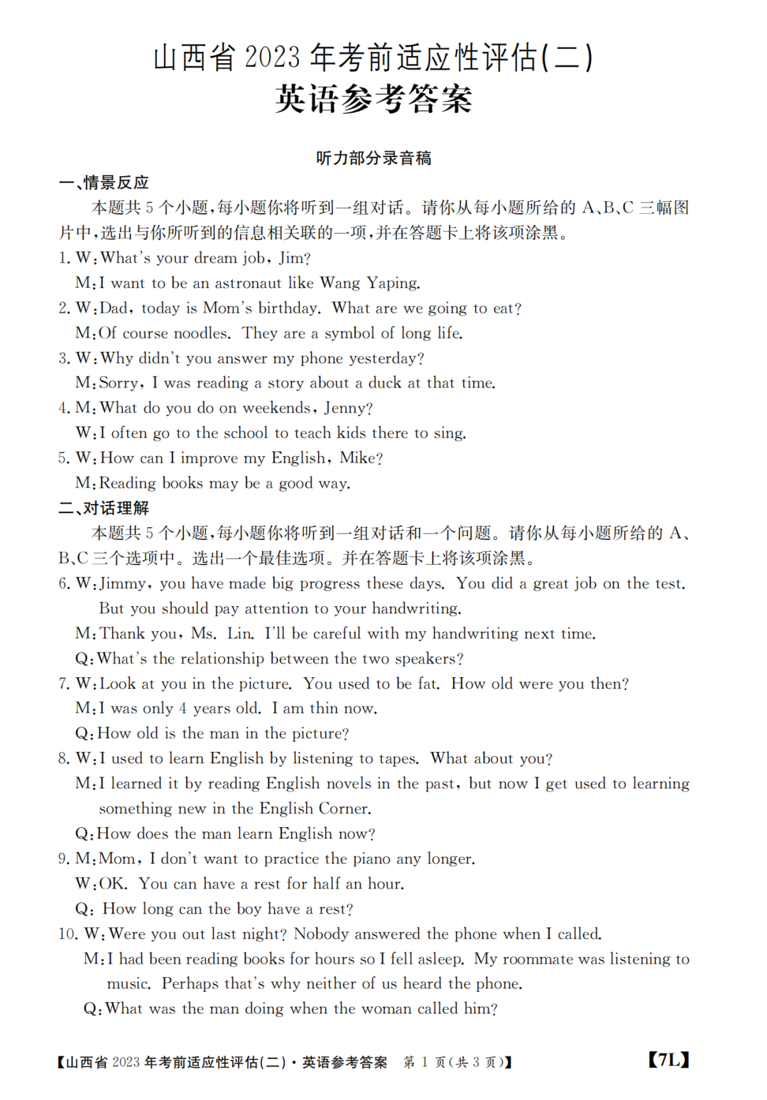 山西2023年中考前适应性评价(一)试题答案全含听力