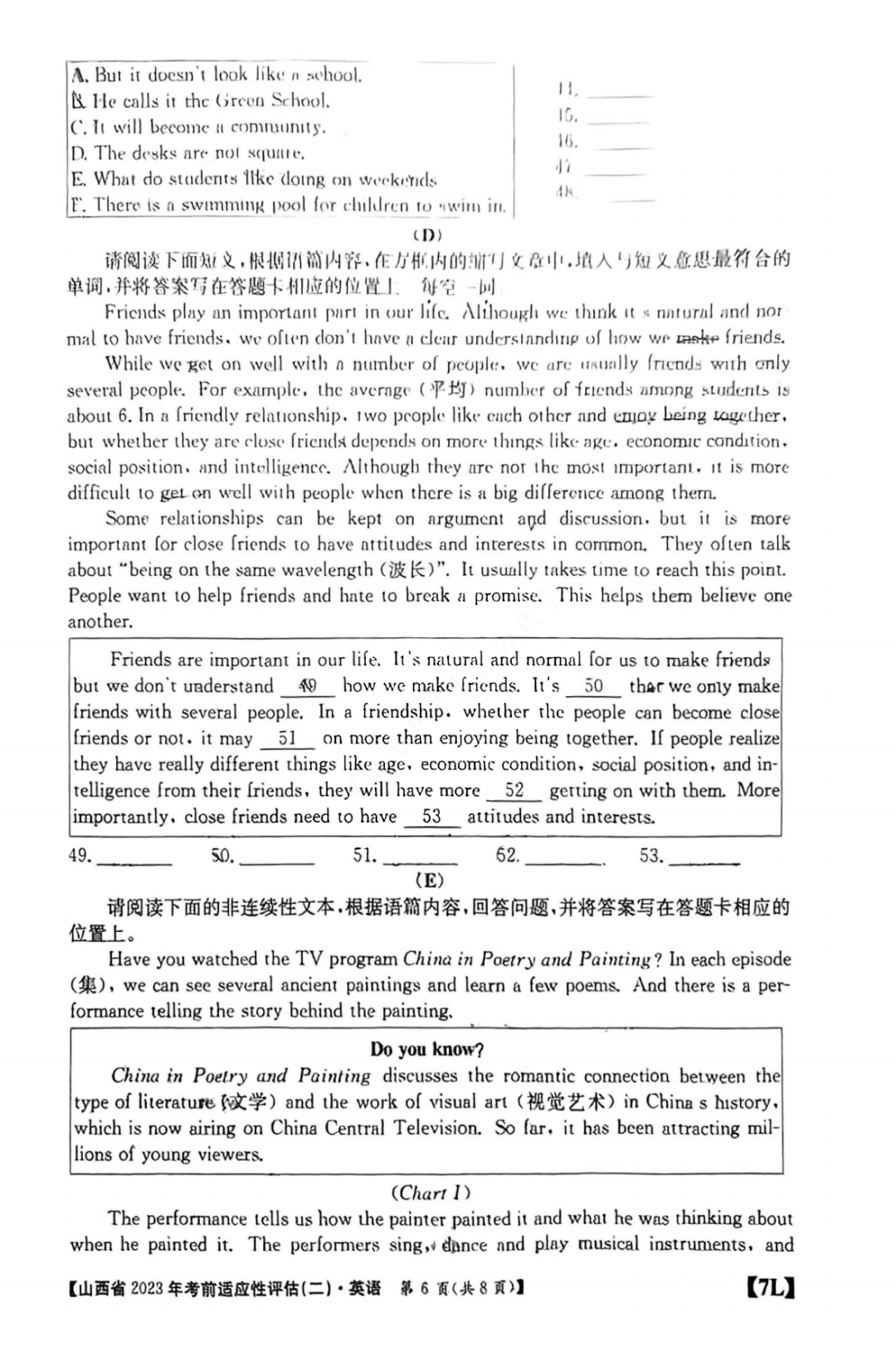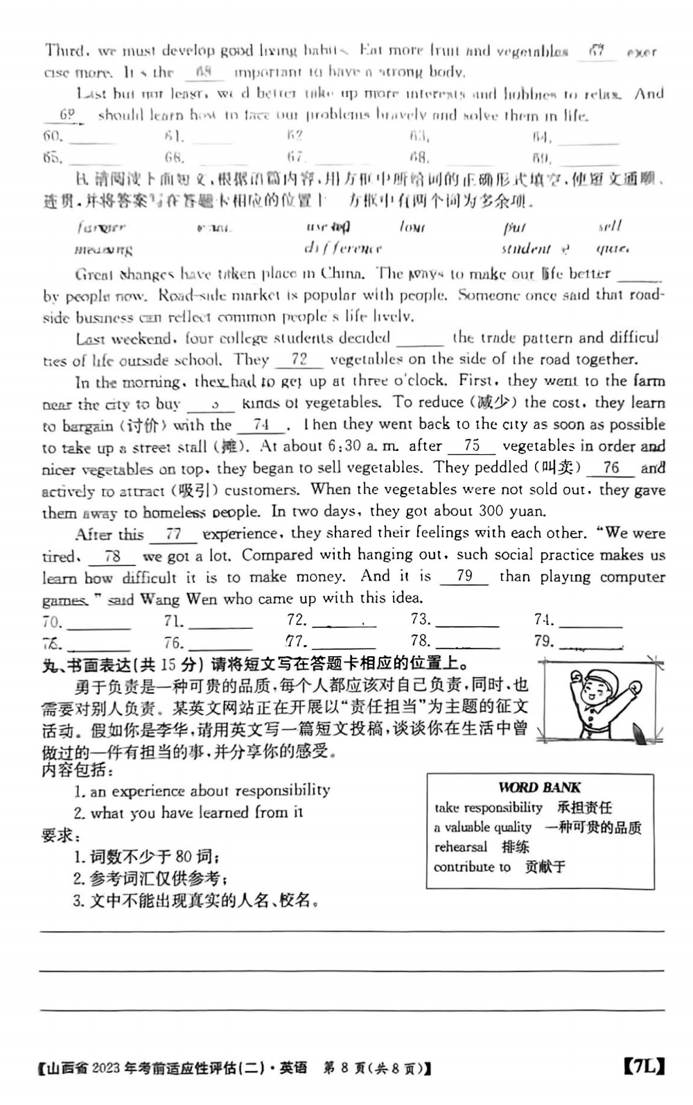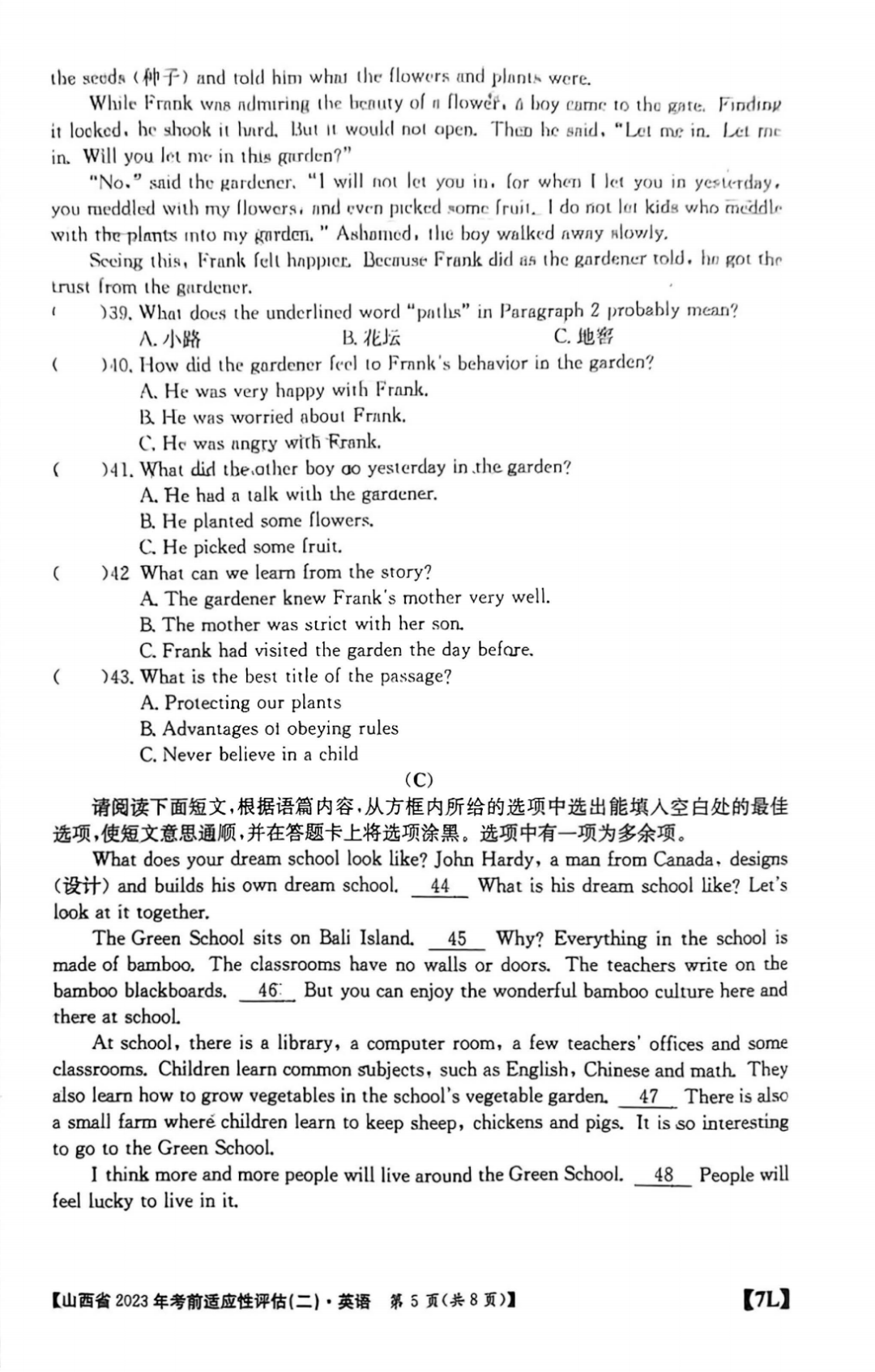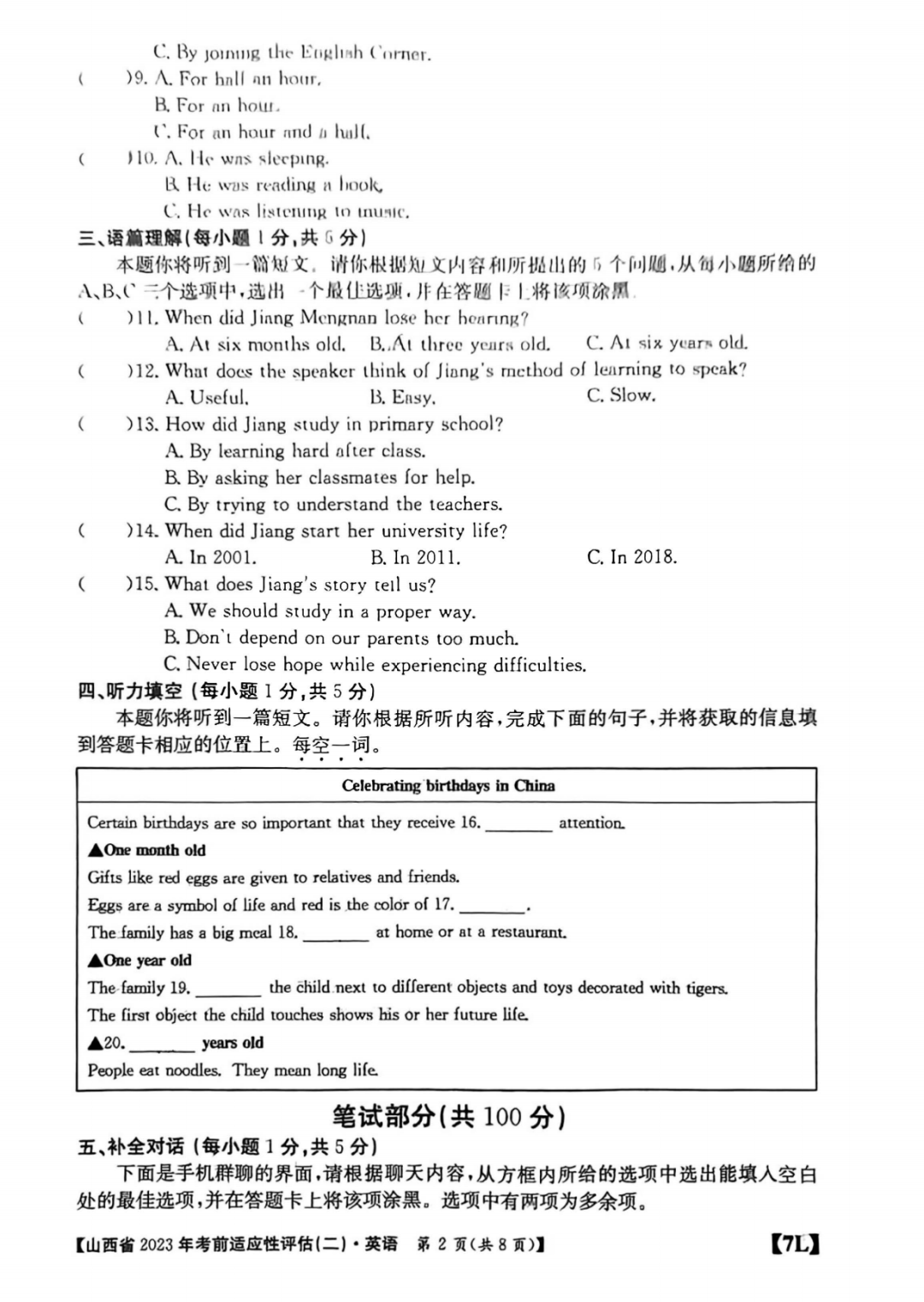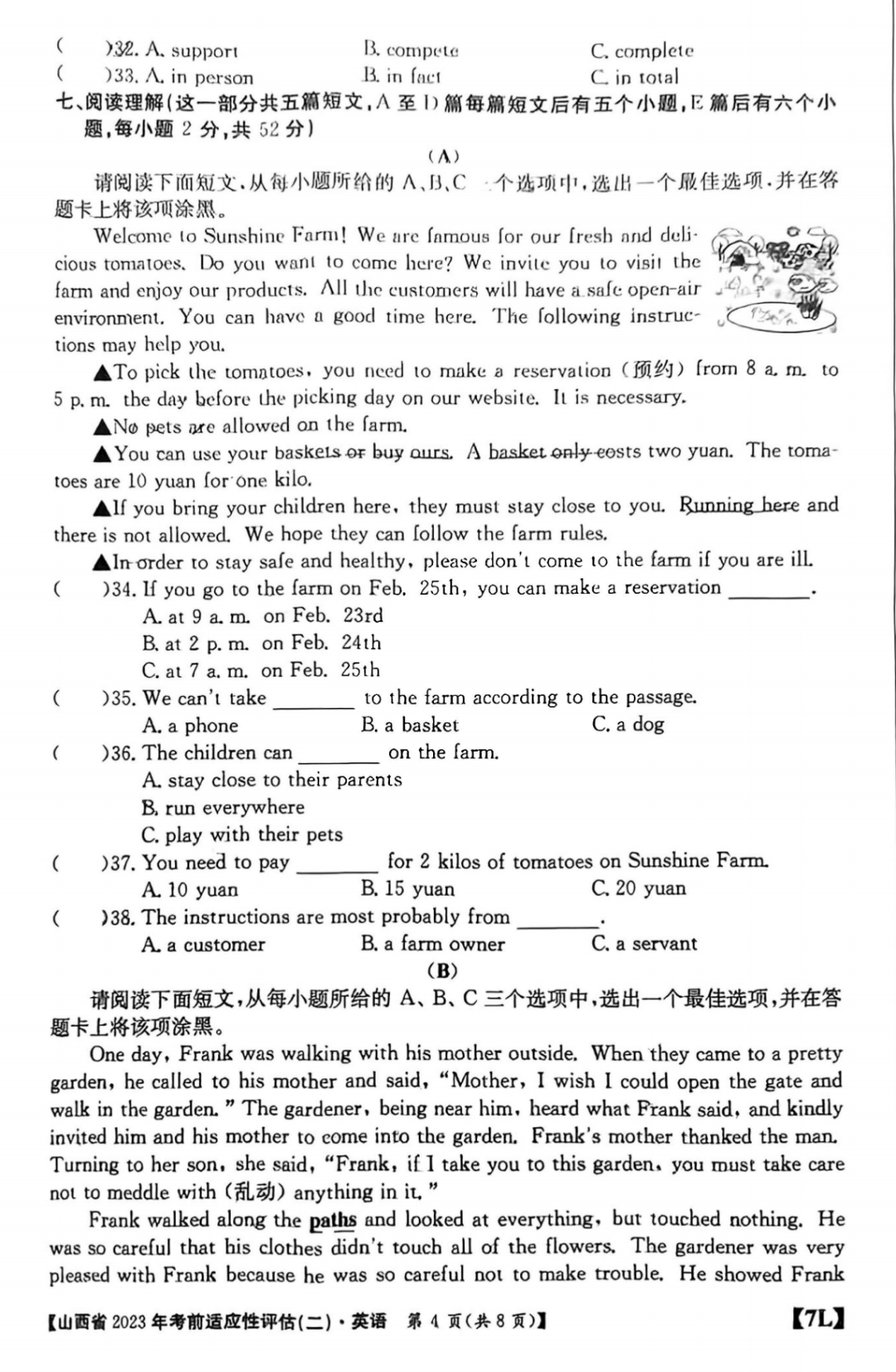 山西2023年中考前适应性评价(一)试题答案全含听力