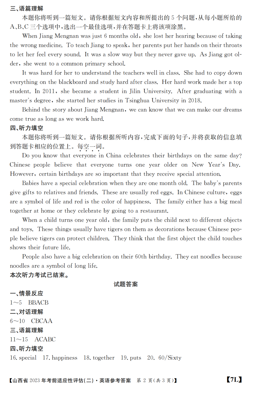 2023年山西省初中学业水平测试信息卷试题答案(含听力)