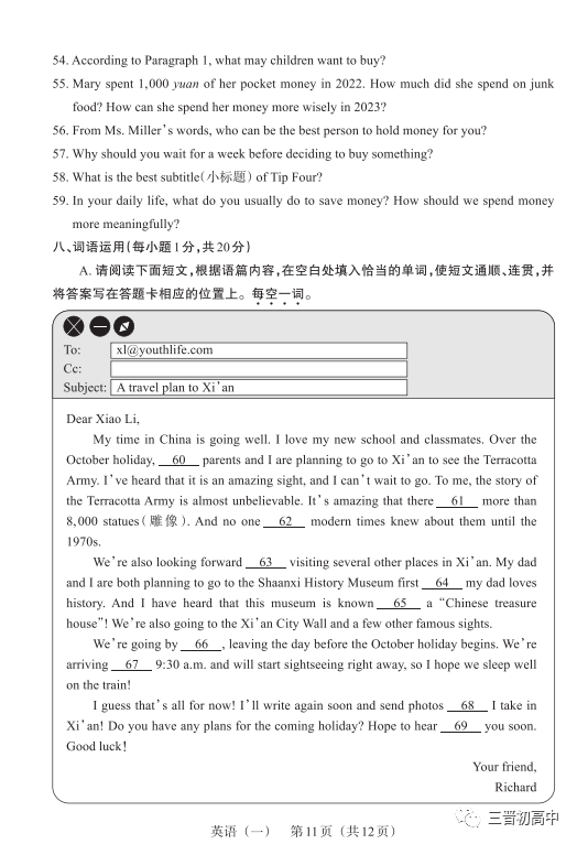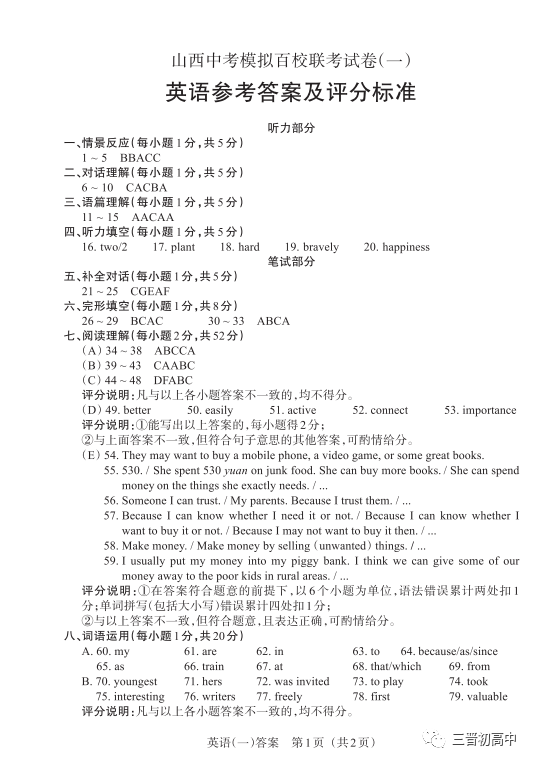 23年山西中考百校联考(一)语文、理综答案+试卷(高清)