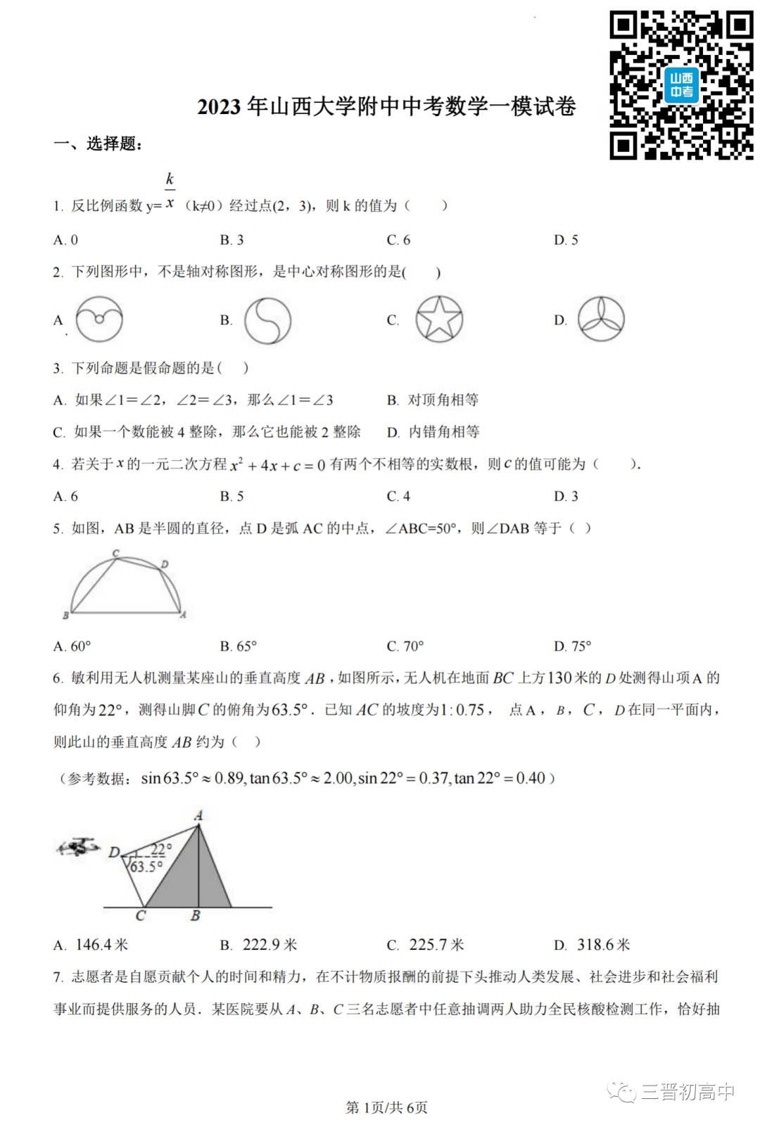 【备战2023山西中考】近六年百校联考(一)试题+答案领取