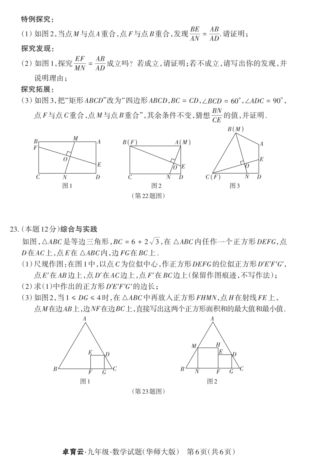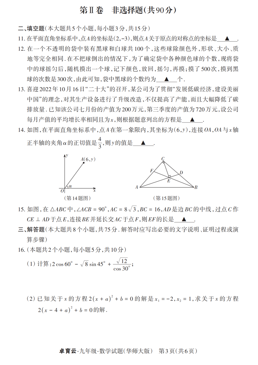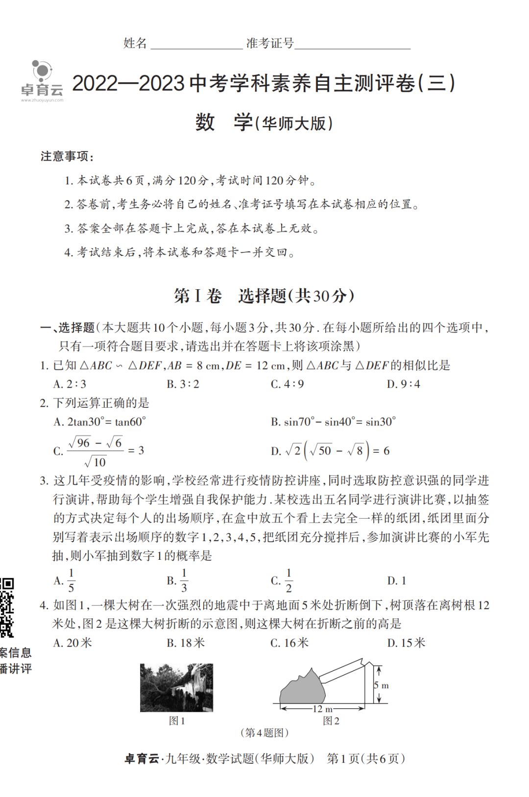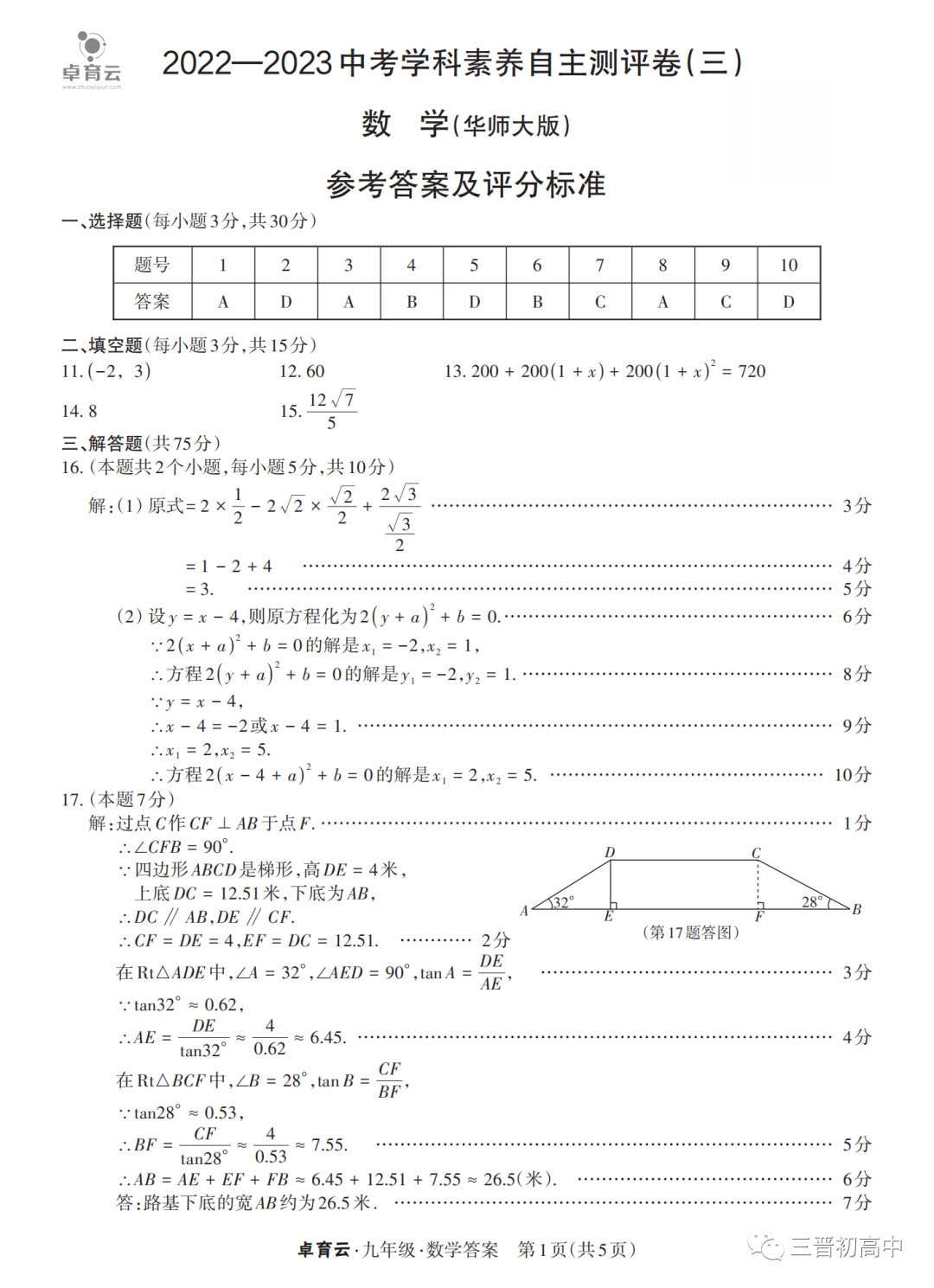 卓育云22-23中考学科素养自主测评卷(三)数学(华师大)试题及答案