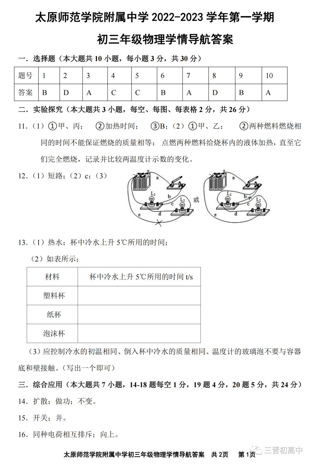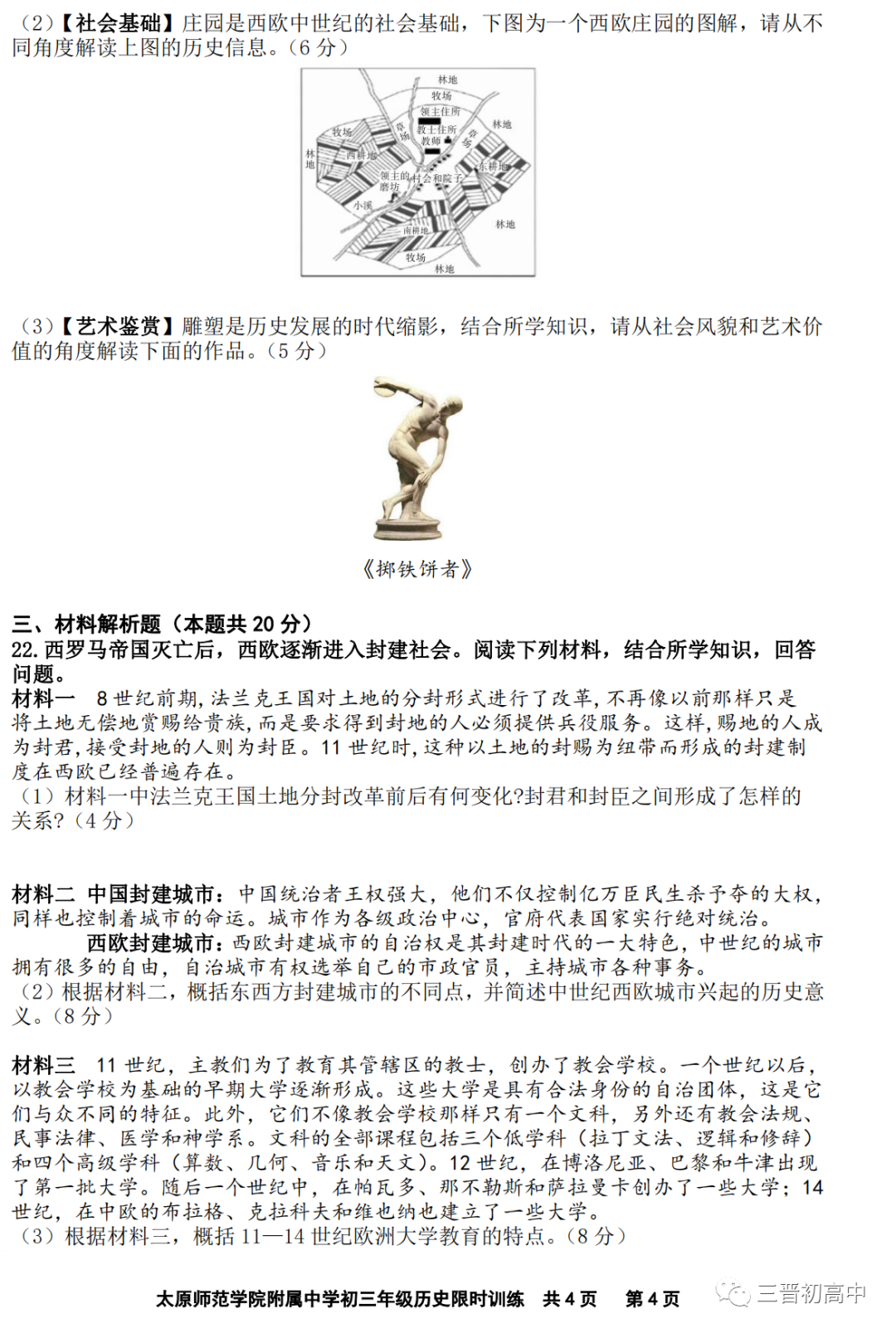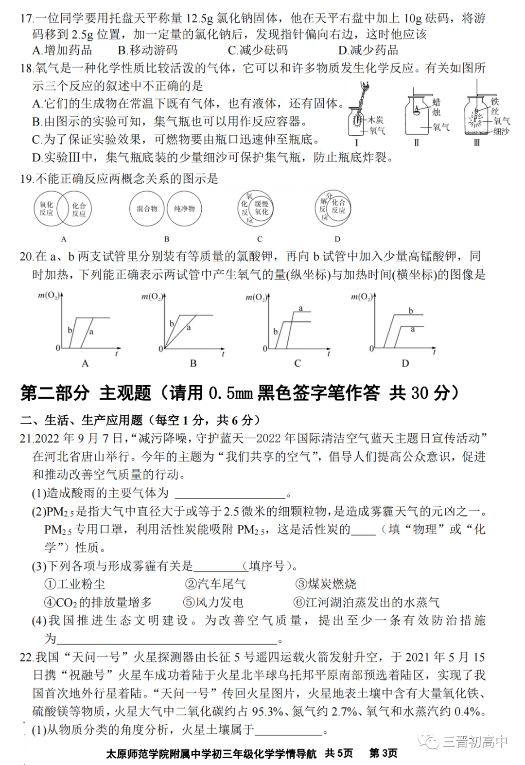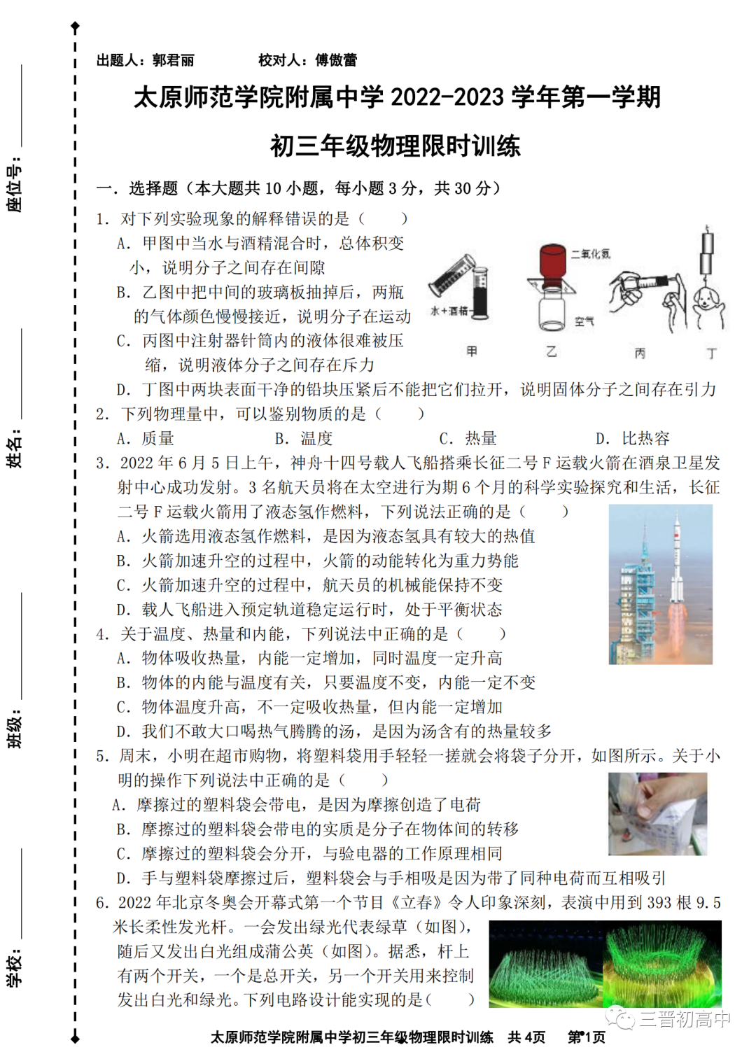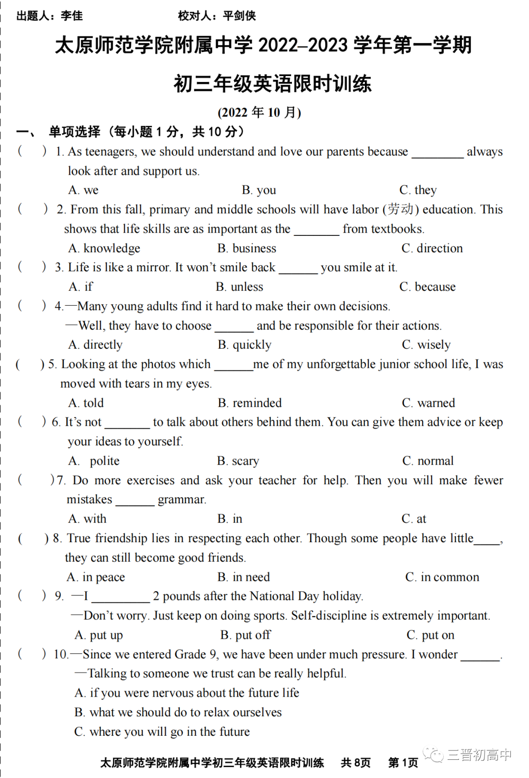 【初三月考】太原师院附中22-23学年第一学期10月月考全科试题及答案汇总