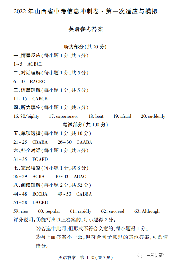 2022山西中考信息冲刺卷 第一次适应与模拟试题及答案全
