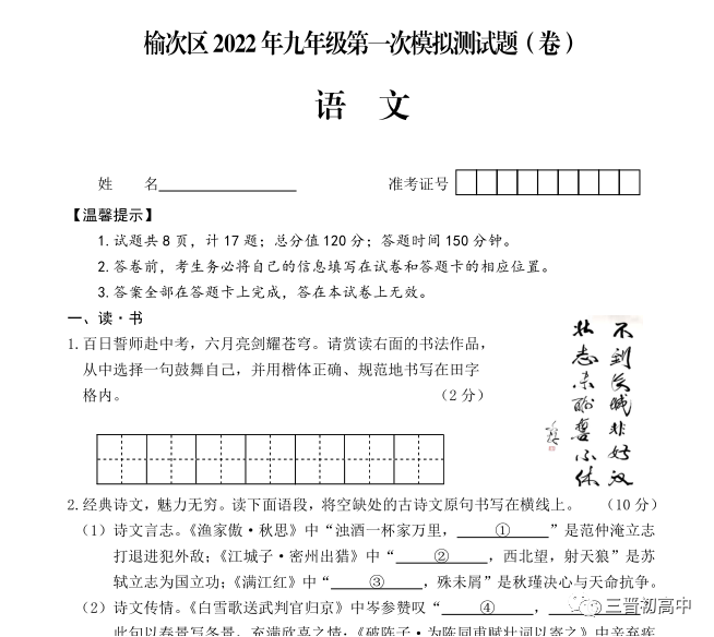2022年晋中榆次区中考一模 【全科试题及答案下载】