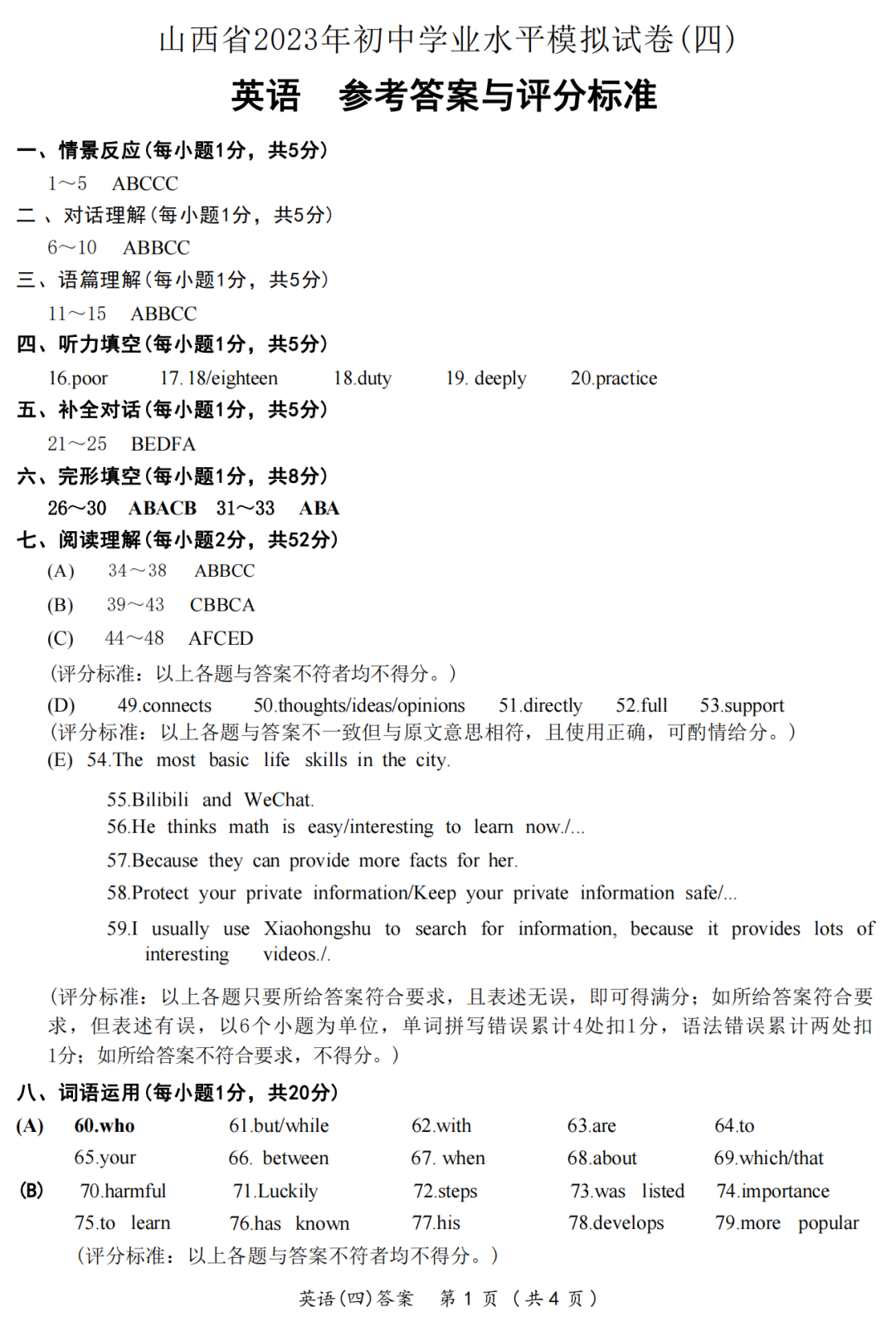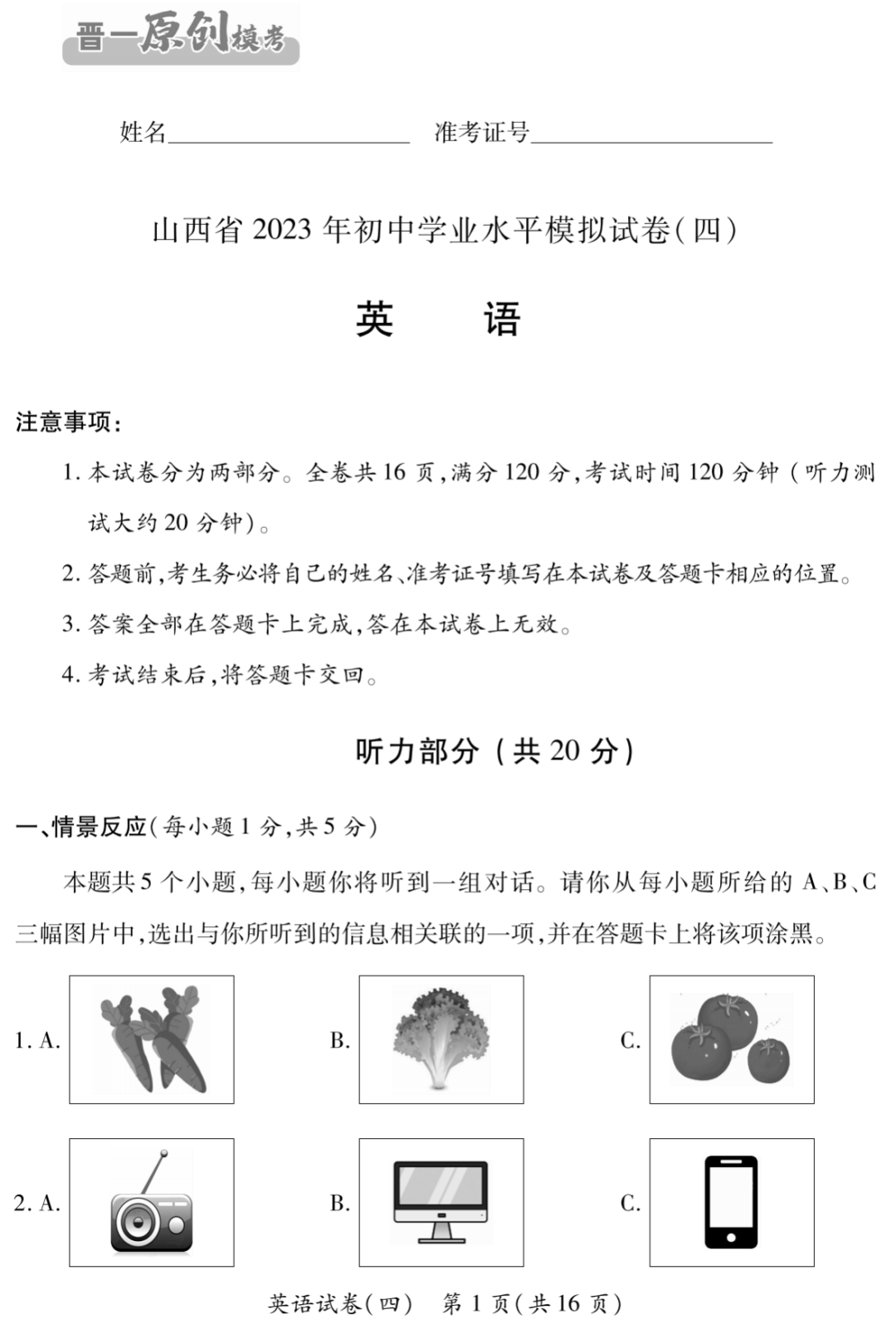 晋一原创模考-山西2023初中学业水平模拟卷四