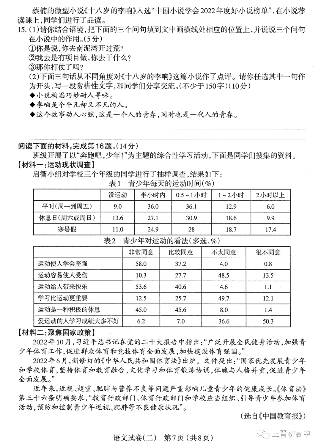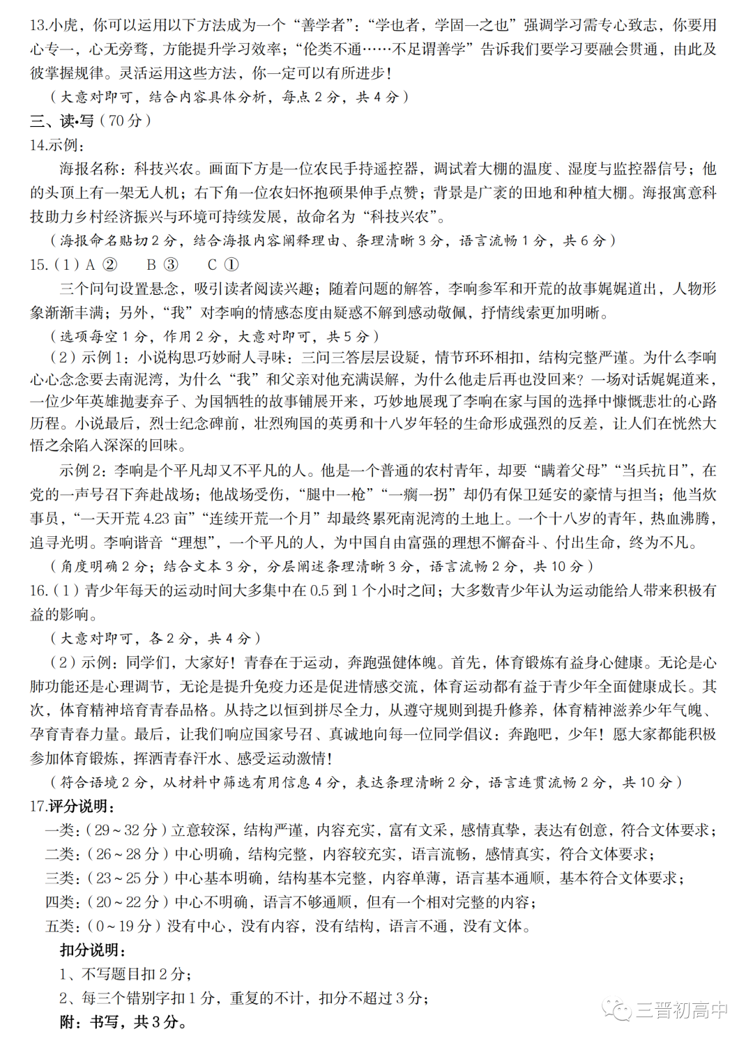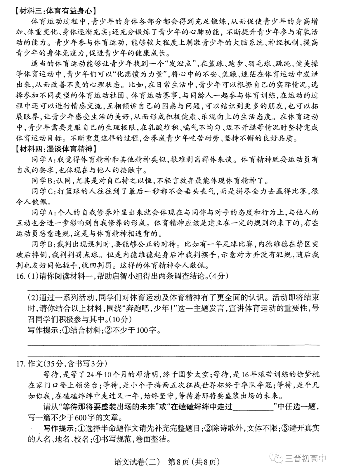 晋一原创卷 山西2023初中学业水平模拟测评三试题答案全
