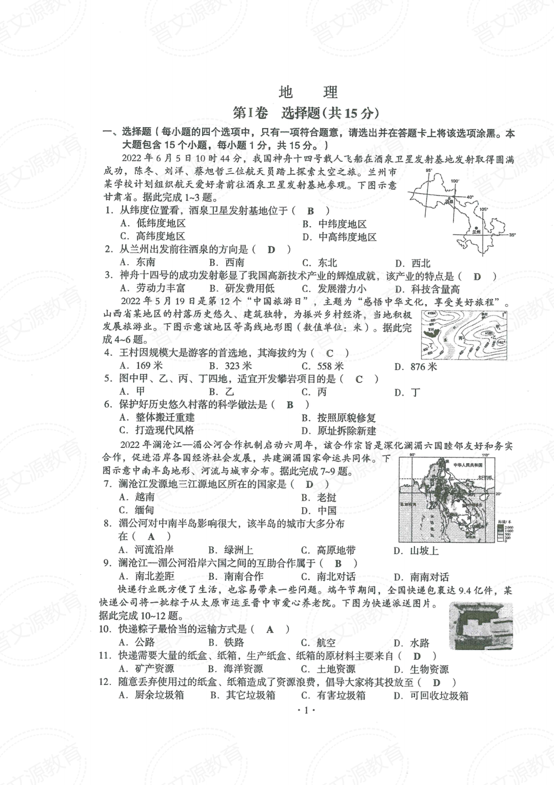 阳泉、长治版22年中考真题(地理+生物)
