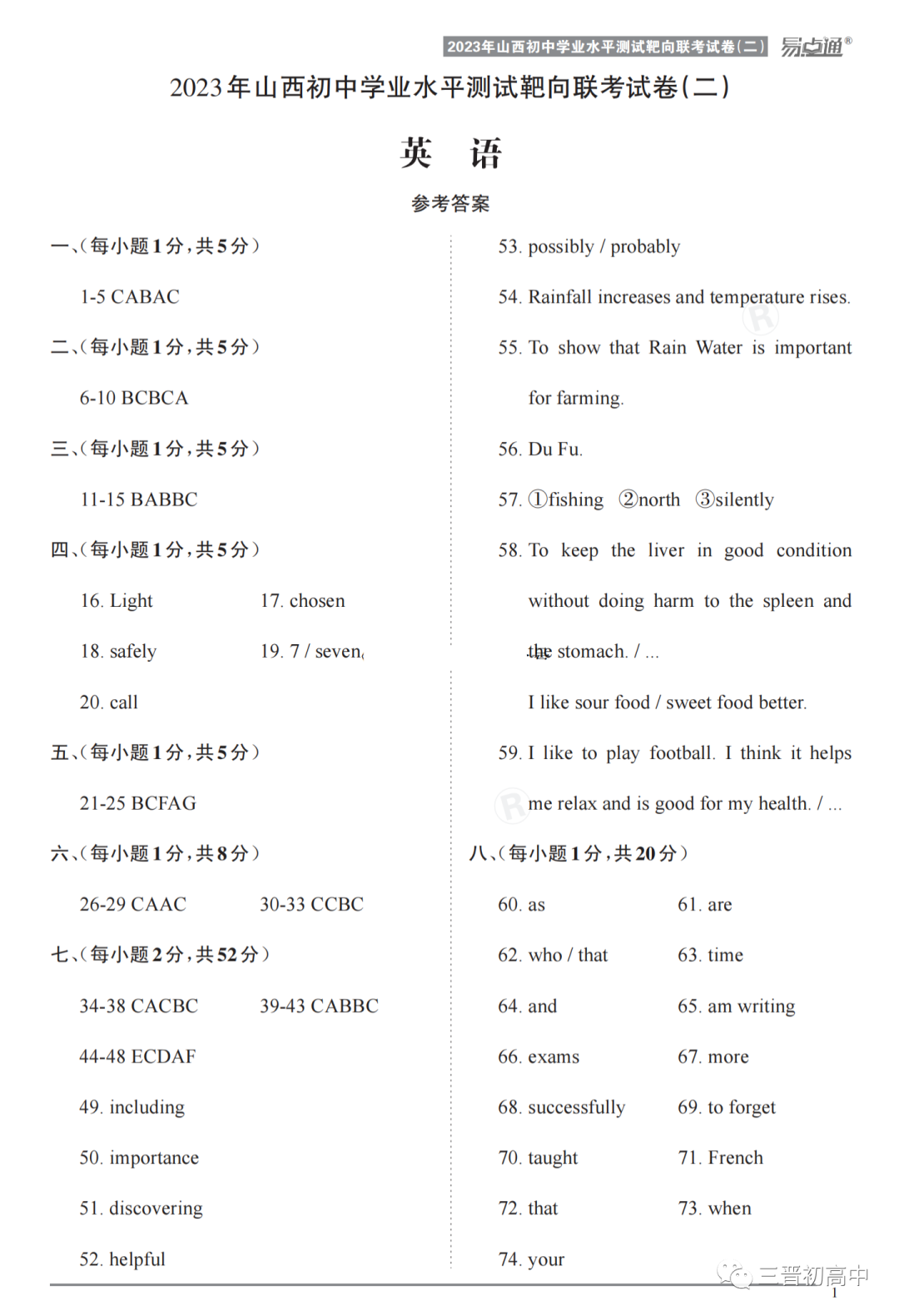 易点通2023年山西初中学业水平靶向联考卷一全科试题及答案