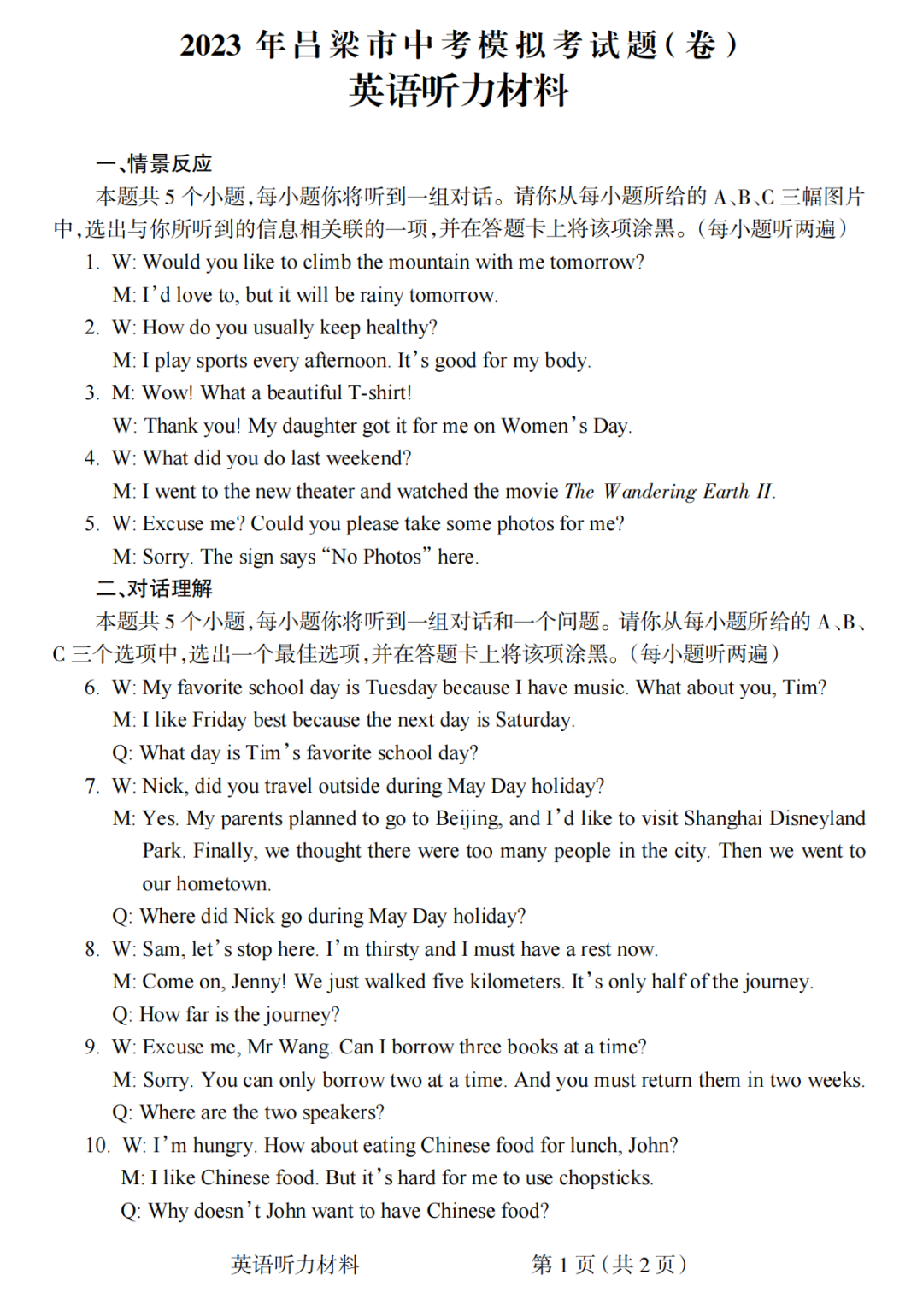 2023山西吕梁中考模拟卷