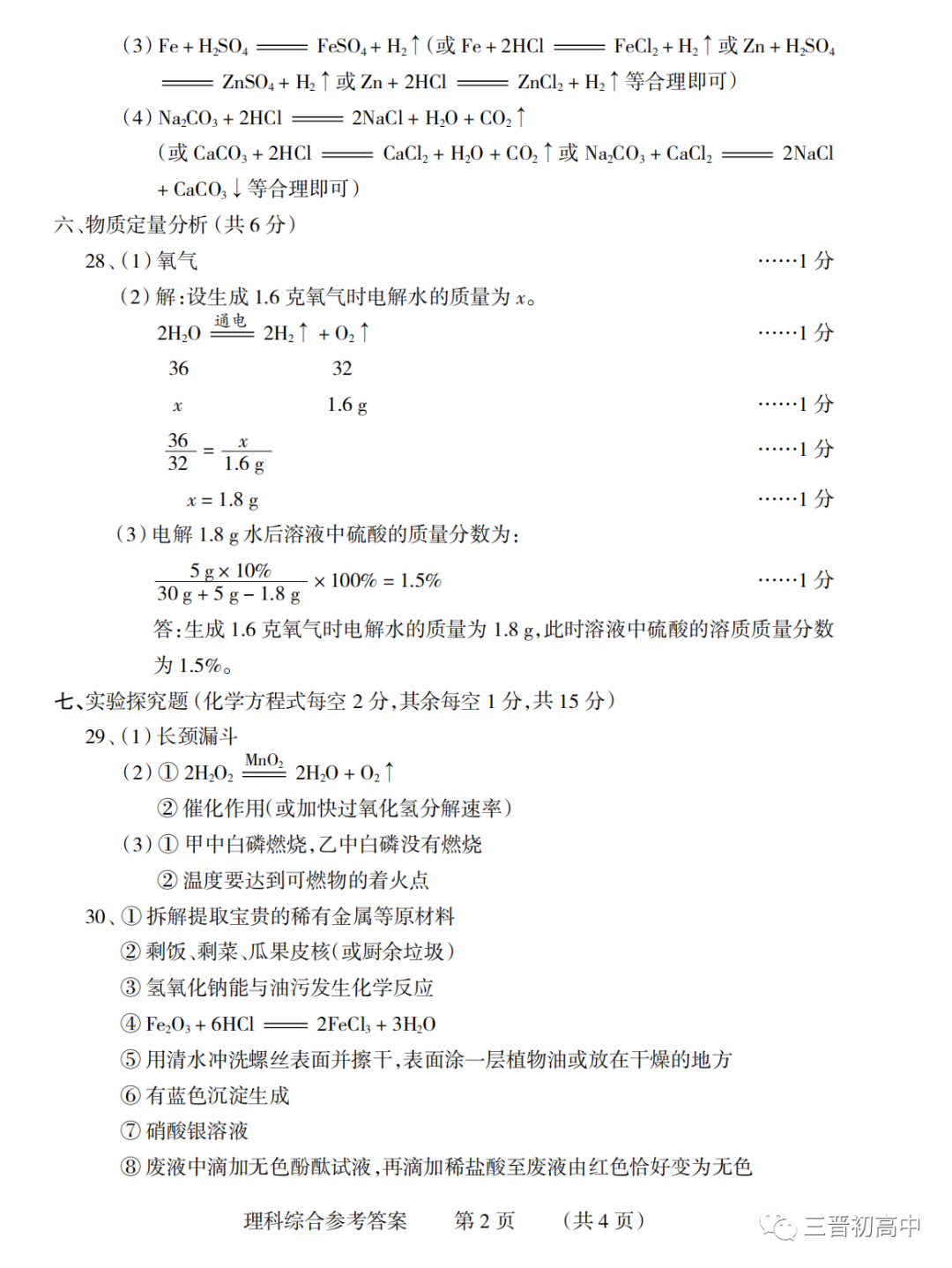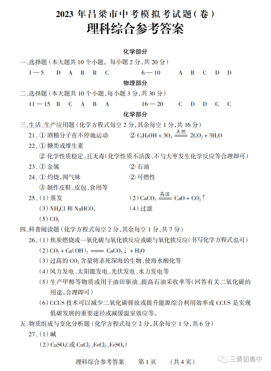2023年运城、阳泉九年级教学质量监测试题答案汇总