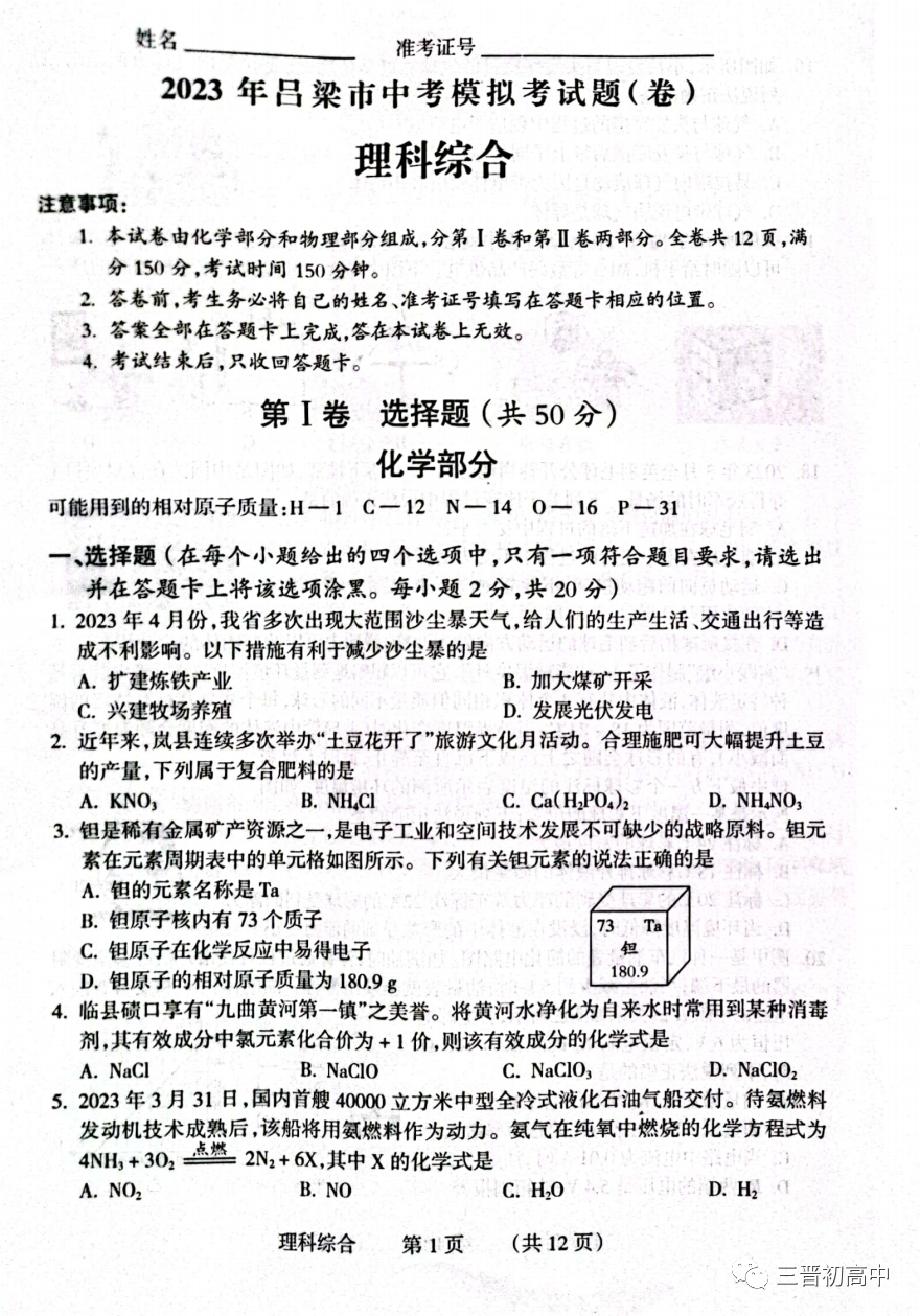 2023山西吕梁中考模拟卷