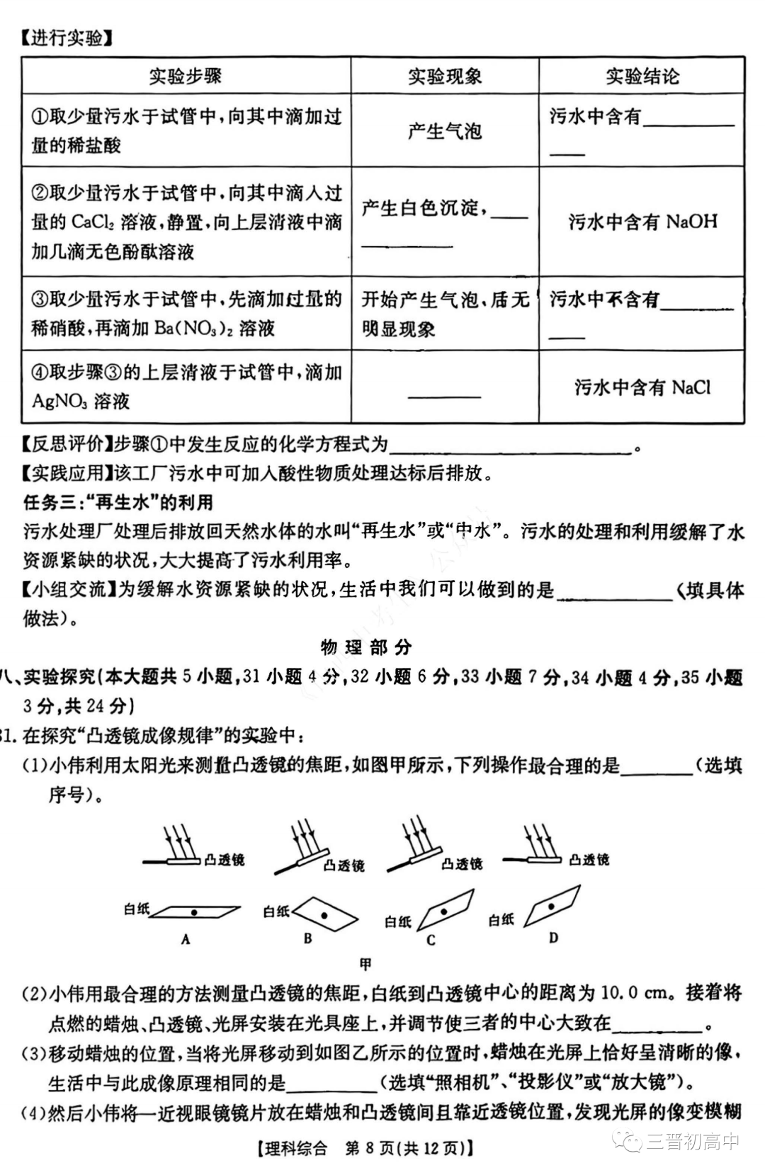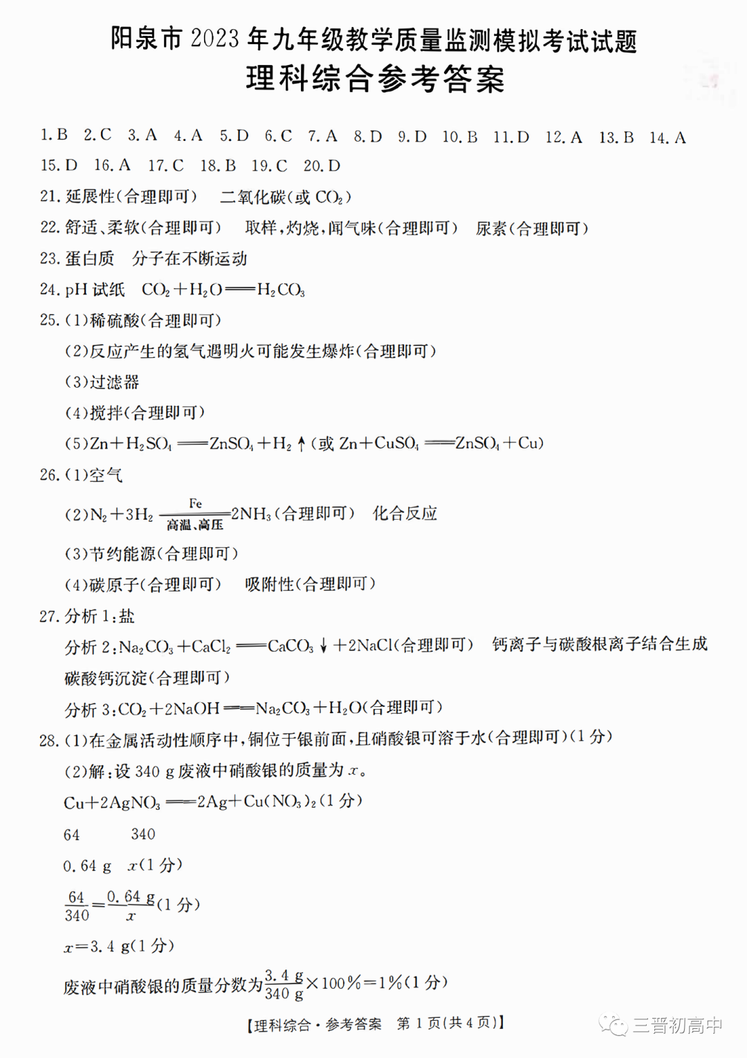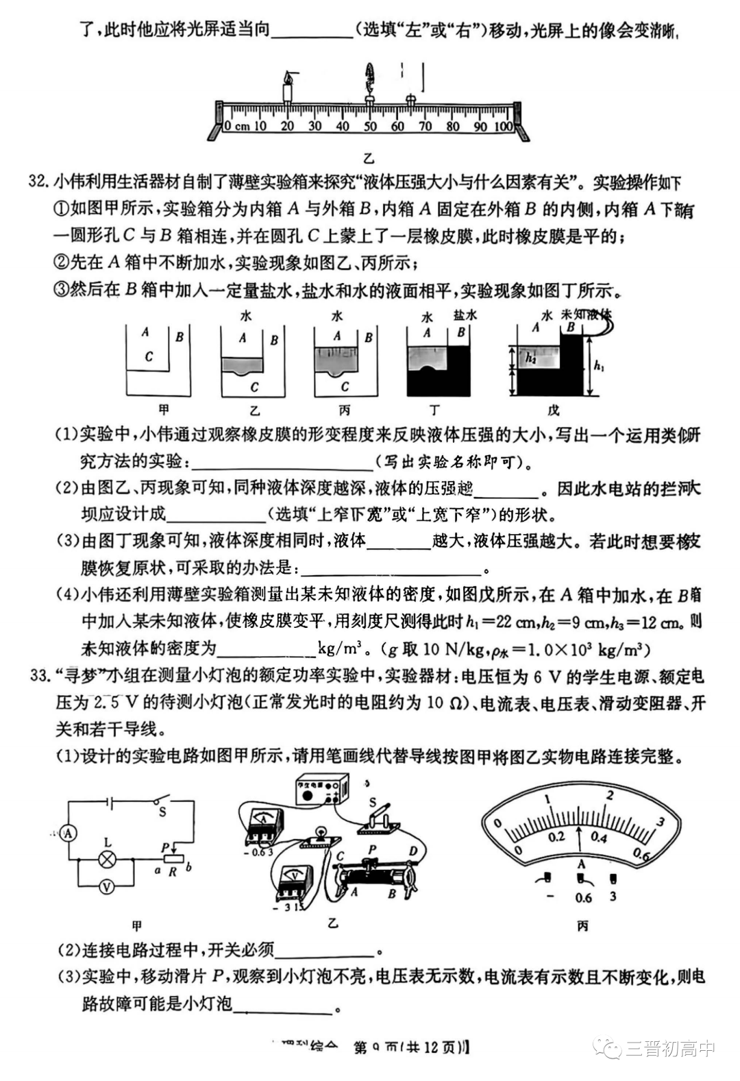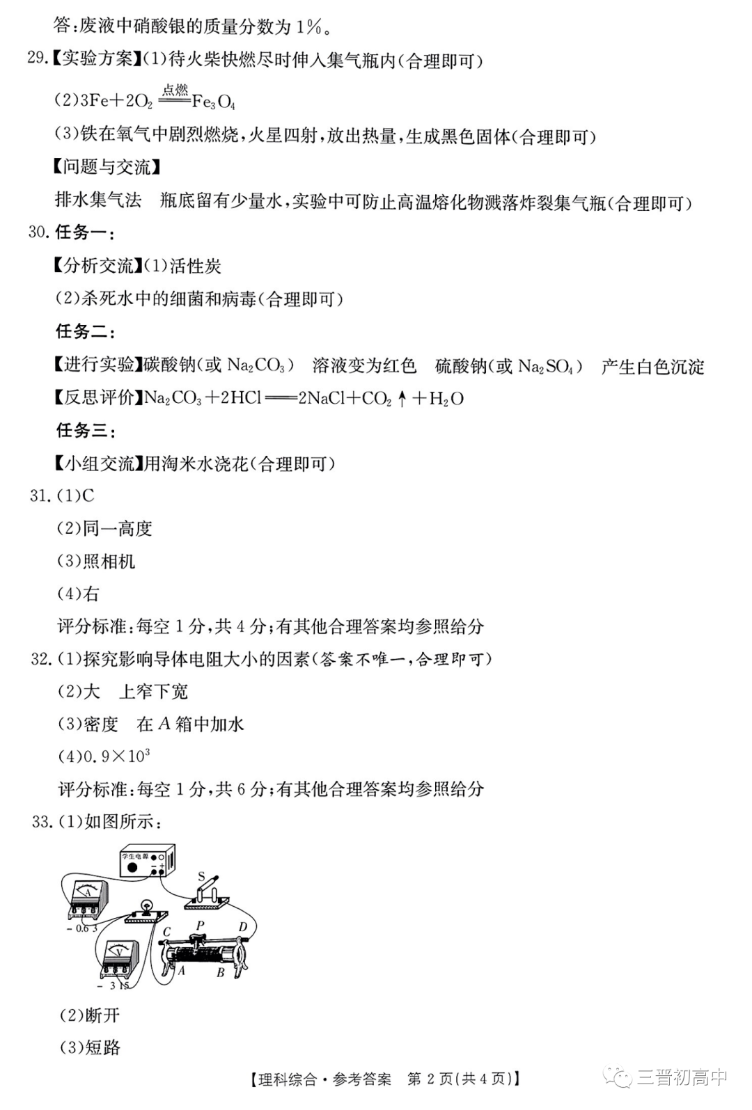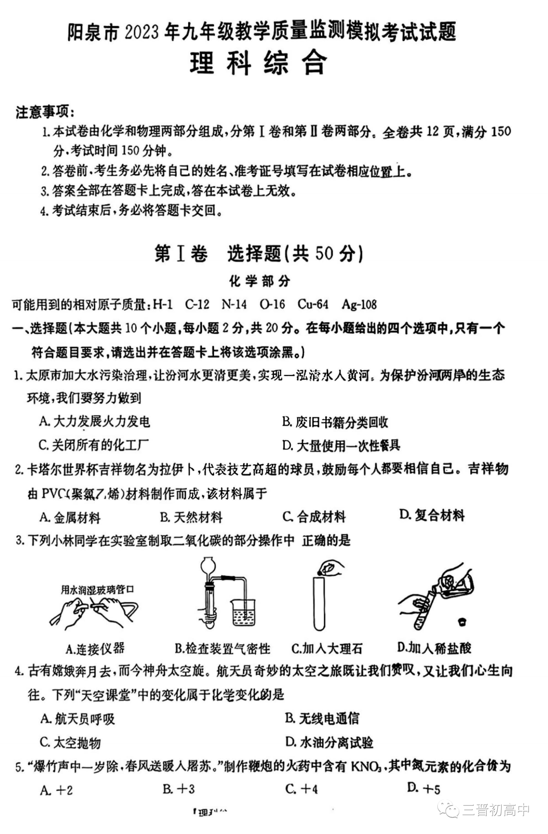 2023年阳泉市九年教学质量监测理综试题及答案​