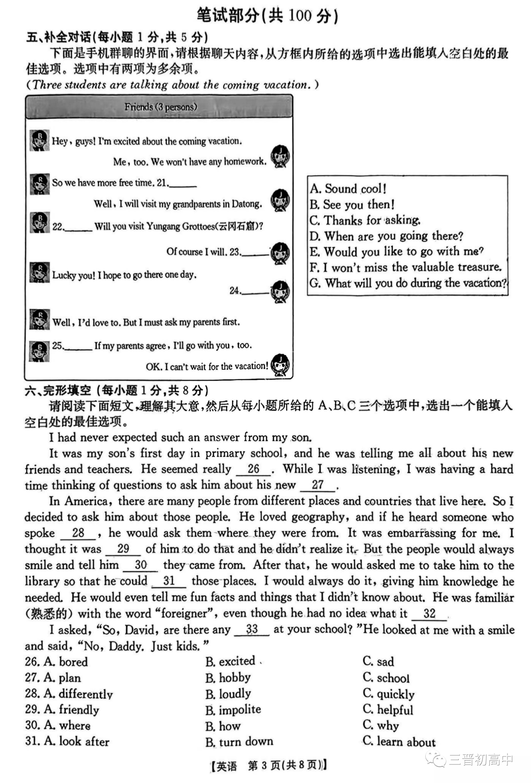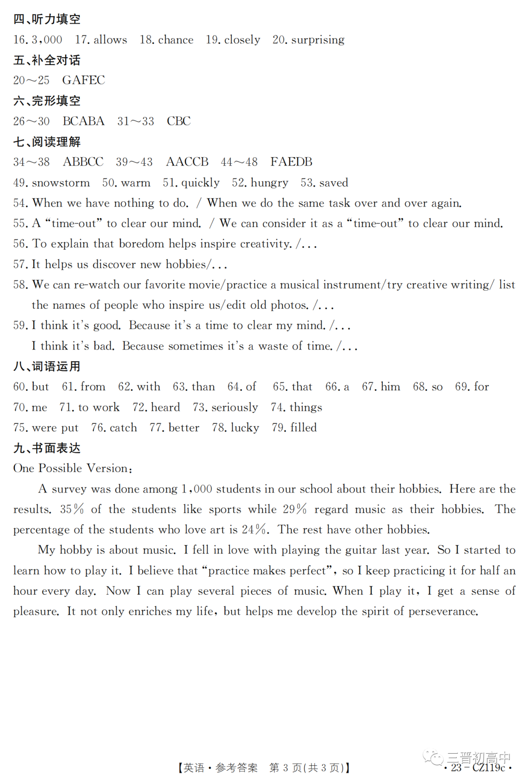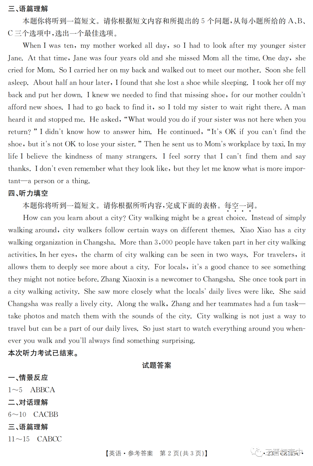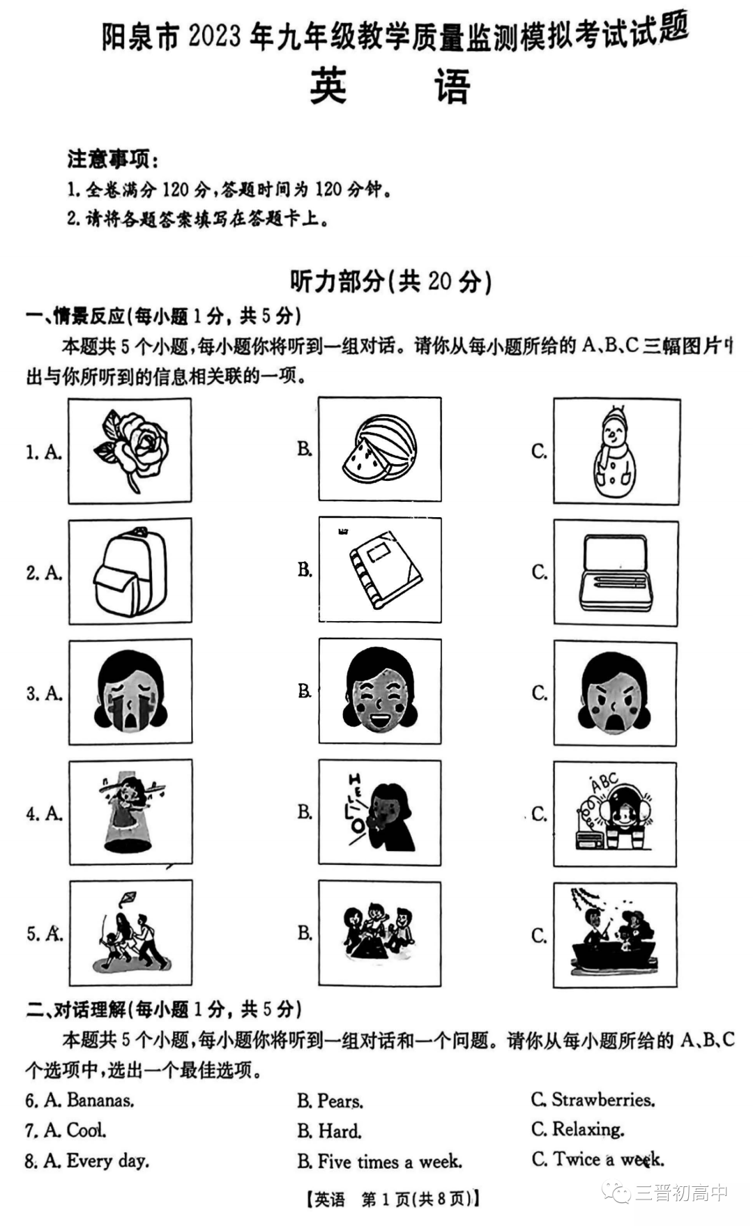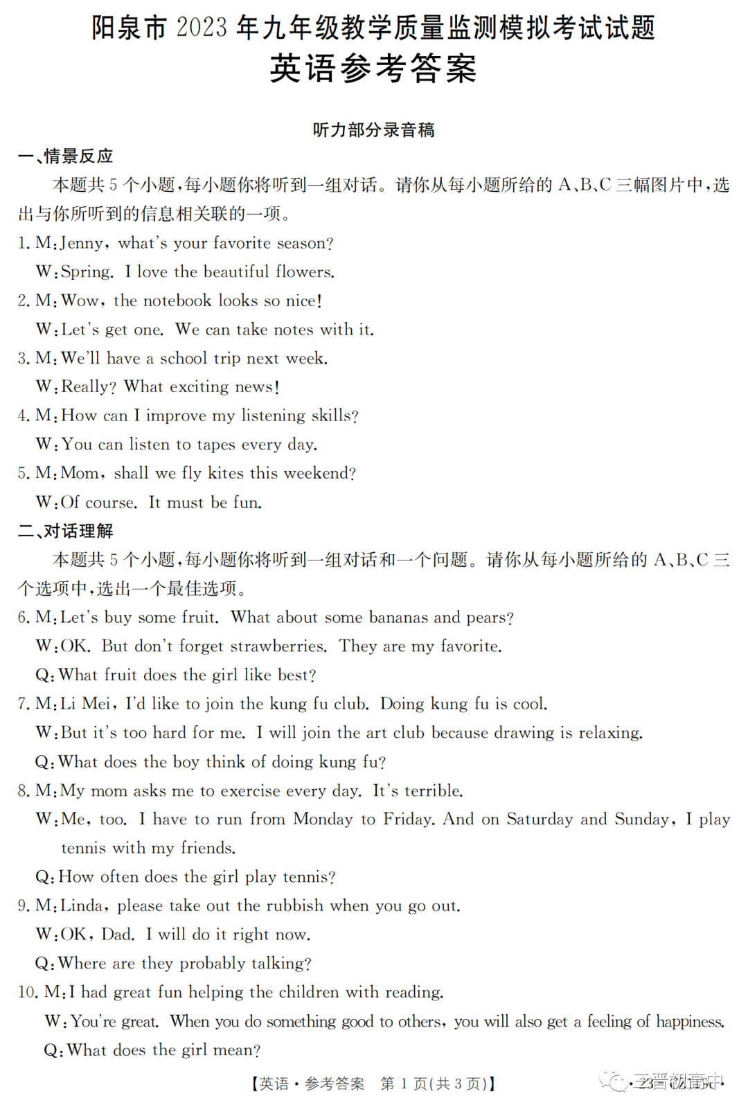 2023年山西省初中学业水平测试信息卷试题答案(含听力)