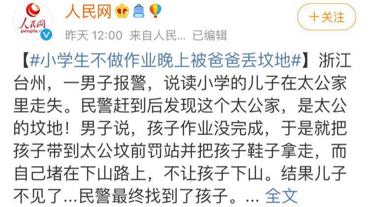 浙江台州有位爸爸,因为孩子不好好写作业,一气之下把孩子带到太公坟前罚站,让他反思,并把孩子鞋子拿掉,而自己堵在下山路上,不让孩子下山。