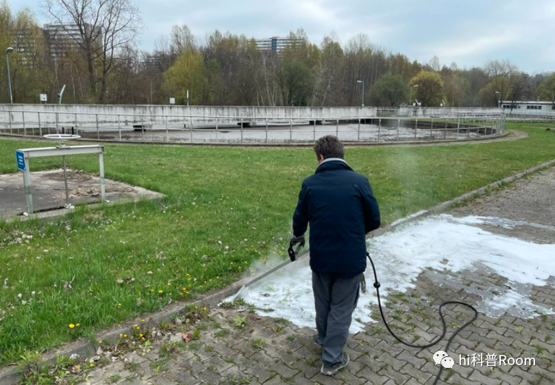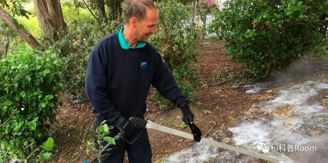 近年来,为了人体的健康,一种“泡沫除草”的方式从欧洲传播开来,英国威尔士的某个公园里出现了这样一副场景,一个工作人员手持喷洒器向公园里的树丛喷洒泡沫,泡沫就像一个白色的地毯把植物覆盖起来。