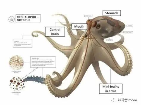 章鱼拥有着完全“不科学”的身体构造。章鱼没有脊椎,靠8条可收缩的腕足作为行动器官,体内有3颗心脏,以及1个主脑、8个副脑。