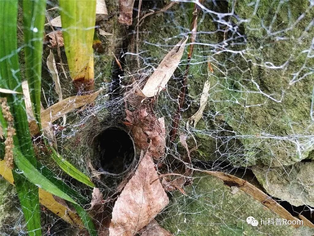 最后在一处落叶密集的角落,一行人发现了一个不起眼的洞穴,根据封住洞口的蛛丝基本上可以断定,这里很可能住着一只虎纹捕鸟蛛。因为虎纹捕鸟蛛在占完洞穴后,会吐出很多蛛丝把洞口堵住,这样一方面可以防止其它的小动物进入它的洞穴,另一方面,通过洞口的蛛丝,它就能感知到猎物的方位和距离,可以迅速捕食猎物。