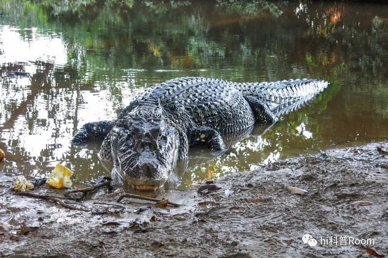 黑凯门鳄的体长可达5.5米,体重可达850公斤,性情凶残,成年后可以猎食所有南美洲陆地和水中的动物,包括小凯门鳄、巨水獭、森蚺等。如果遇到体型太大的猎物,它就会拖到水里进行死亡翻滚,扯下猎物的肉吞食。