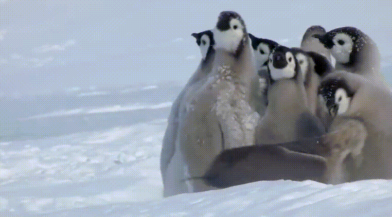 等到雄企鹅安全地将蛋滚到自己脚上,并合拢双脚,雌企鹅才能安心离开。它要回到一百多公里的海岸线,下海觅食。在雌企鹅不顾一切奔向海边时,凛冽的飓风会夺走其中一部分雌企鹅的生命。即便它们成功到达海岸线,还有很多海豹在冰下等着捕食这些雌企鹅。此时远在北极腹地的雄企鹅正在备受煎熬。成千上万只帝企鹅必须紧紧贴在一起,背风而立,围成一个密不透风的企鹅堆来抵抗严寒和飓风,保持体温。这段孵蛋的时间接近两个月,所有企鹅奶爸都低着头,不吃不喝,靠体内储藏的能量度日。这样才能最大程度的保证幼崽的孵化万无一失。