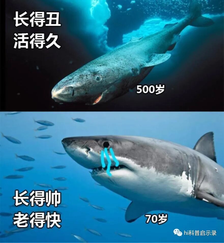 2016年,科学家通过实验研究,测出了一种巨型鲨鱼的寿命高达500年。明明都是鲨鱼,为什么大白鲨的寿命却只有70年?原来生命在于静止!这种世界上最长寿的脊椎动物名叫格陵兰睡鲨,2016年,丹麦哥本哈根大学的海洋生物学家John Steffensen团队,对捕捞到的28头雌性格陵兰鲨进行了考察,通过对它们的眼部晶状体使用碳-14测年法,再结合其体型来判定其年龄。
