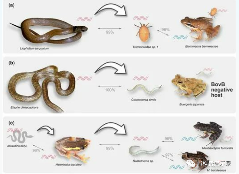 当地蛇的一段基因BovB有着强大的能力——将自己的DNA点位复制到其他位置上。这种移形换影、移花接木的一招确实厉害,从蛇的身上水平转移到了寄生虫、水蛭等物种的转移下,进入到了青蛙体内。