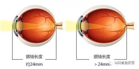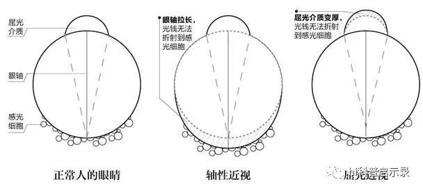 但是我们很少看到近视1000度以上的患者,更别提3000度了。要知道近视度数为什么这么高,我们首先要知道什么是近视度数。先看这张图,我们假设正常人的视力极限可以看到远景,而近视患者最多只能看清楚近景。之所以会这样,是因为近视患者眼球内的眼轴拉长了,导致光线焦点难以到达眼球内部的感光细胞,所以看到的远景就会变得非常模糊。正常人的眼轴长度只有22-24毫米左右,一般的近视患者眼轴最多被拉长到28-30毫米,然而这位武汉梁女士的眼轴却拉长到了惊人的35毫米。这就好比把一个普通人的身高拉长到和姚明一样,这能不出问题吗?