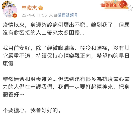 前阵子,这位“行走的CD”不得不画下短暂的休止符。在新冠病毒肆虐全球之际,林俊杰不幸“中招”感染,生活停摆。