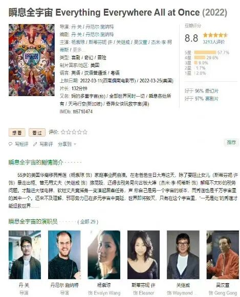 《瞬息全宇宙》是亚裔人员主导的好莱坞大制作,由杨紫琼主演的一部融合科幻、武打、搞笑等多元风格的电影, 虽然还未在国内上映,豆瓣开局已经高达8.8分,成绩颇为不俗。