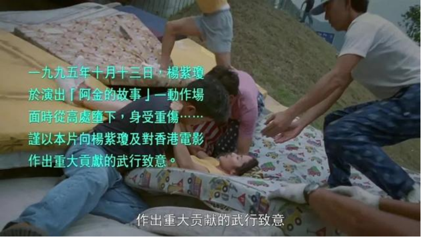 1995年拍《阿金的故事》则更为险象环生,她从18米的桥上跳下,因为受力偏差,她的头重重地砸在两个垫子的夹缝中,两条腿几乎90度弯折,打在了她的后脑勺上。