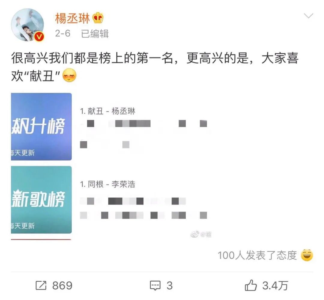 杨丞琳激动得像个刚恋爱的小女生,在微博上晒出了一张“同框”截图,甜蜜发糖——“很高兴我们都是榜上的第一名,更高兴的是大家喜欢‘献丑’。”