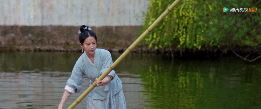 刚开场时,她饰演的赵盼儿撑着篙从远处渐渐靠近。