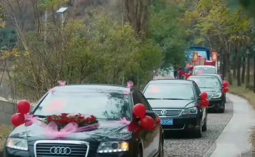新人按照规矩坐在头车,婚礼队伍浩浩荡荡,所有车辆上别着大红色绸缎和粉红的蝴蝶纱。