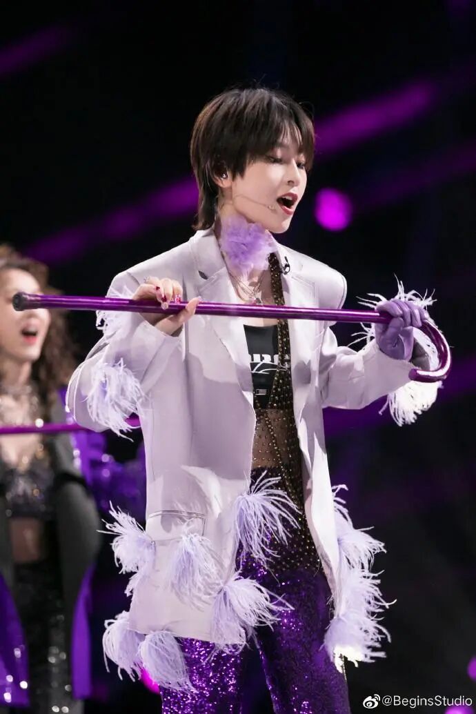 姐姐们同框合唱《青春舞曲》时,周笔畅一身紫粉色简约着装,在一群姐姐中格外清新爽朗。