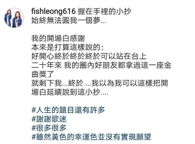 梁静茹在微博晒出了自己早就准备好的获奖感言,还自嘲“命里缺黄色”。