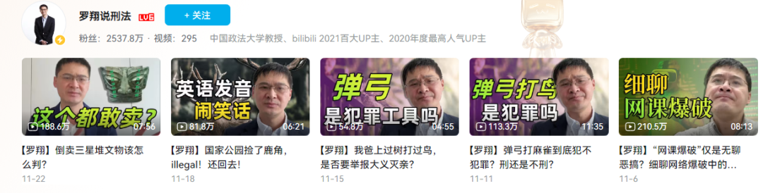 2021年,罗翔获得B站“2021百大UP主”,他谦虚依然:
